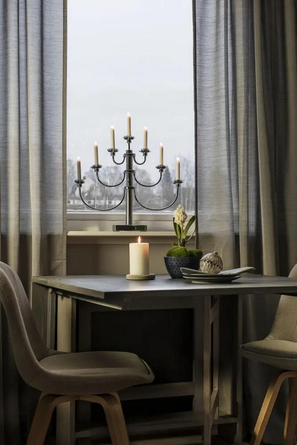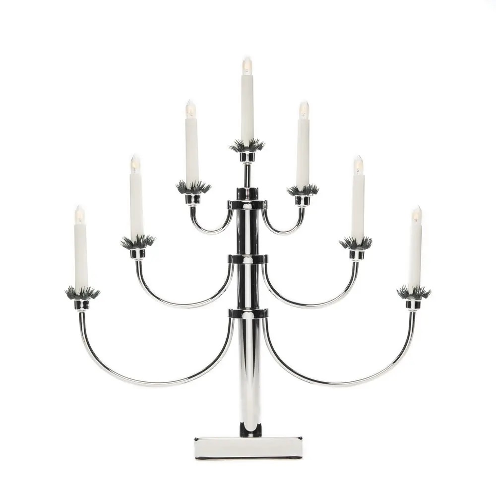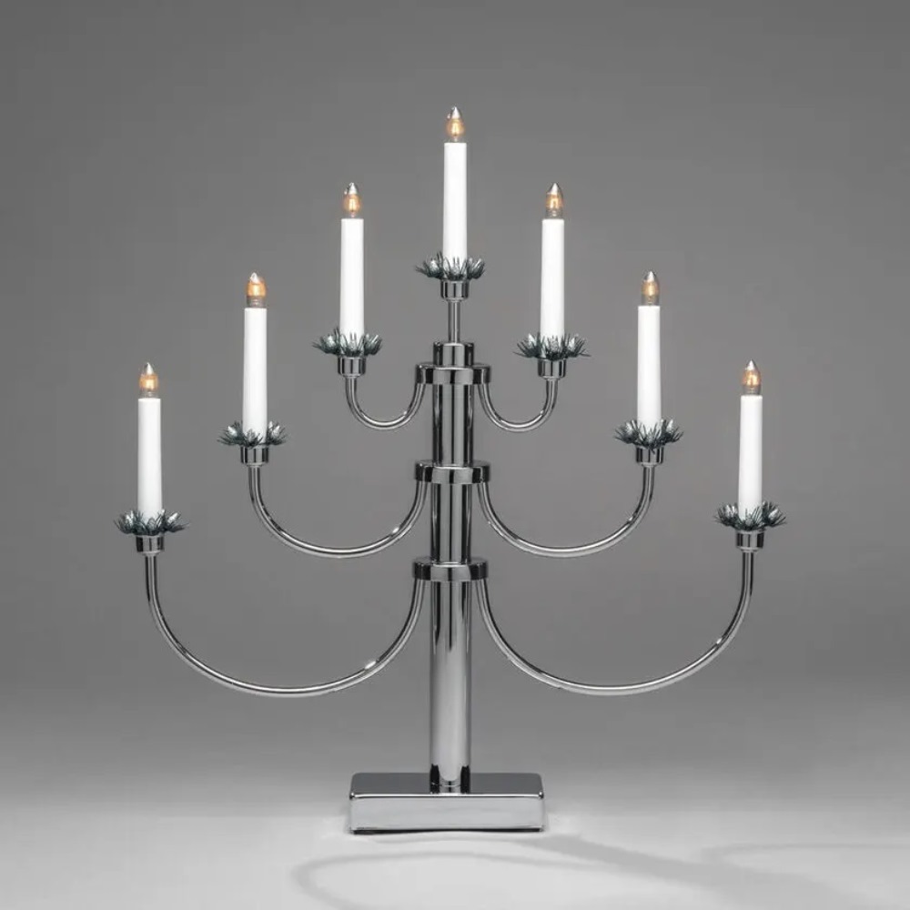 Adventsljusstake i krom från Konstsmide med 7 ljus och dekorativa ljusmanschetter. Den kromade ytan skapar en elegant kontrast mot de varmvita ljusen och sprider ett mjukt, stämningsfullt sken i hemmet – perfekt för att skapa mysig julstämning. En tidlös detalj som förenar tradition och modern design och är perfekt som juldekoration i fönstret, på bordet eller i vardagsrummet. Levereras med en 2,4 meter vit sladd med strömbrytare med transformator. Ljuskälla ingår.