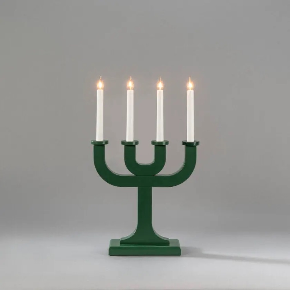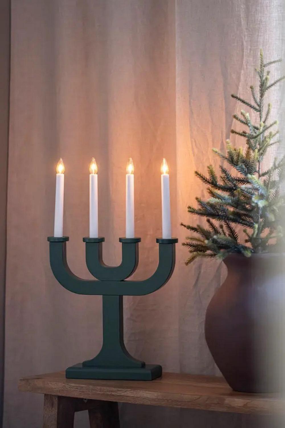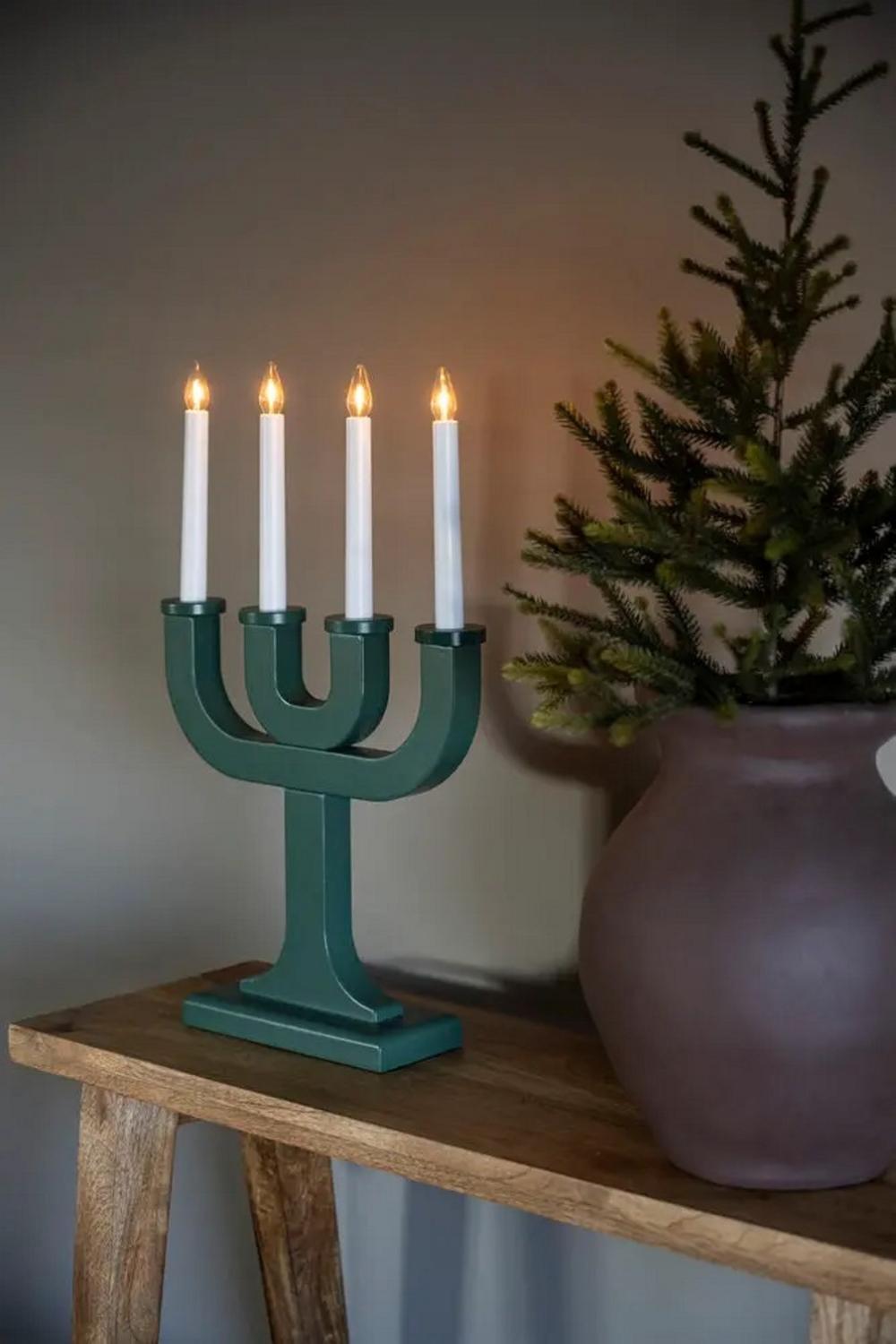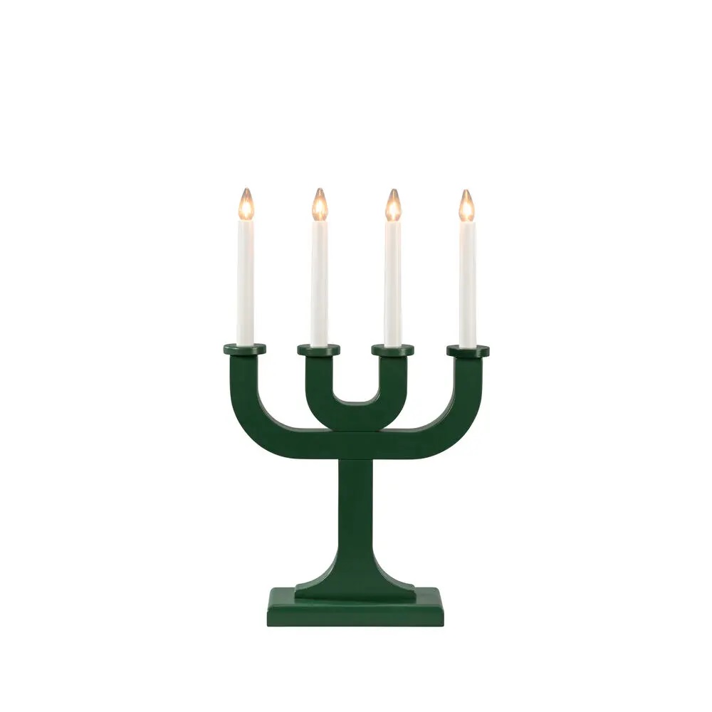 Adventsljusstake i trä, grön från Konstsmide med 4 ljus och stilren, grafisk design. Den lackade träytan skapar en vacker kontrast mot det varma ljuset och ger ett elegant uttryck som passar både klassiska och minimalistiska hem. Perfekt för att sprida mysig julstämning i vintermörkret. Den levereras med en 1,7 meter vit sladd. Ljuskälla ingår.