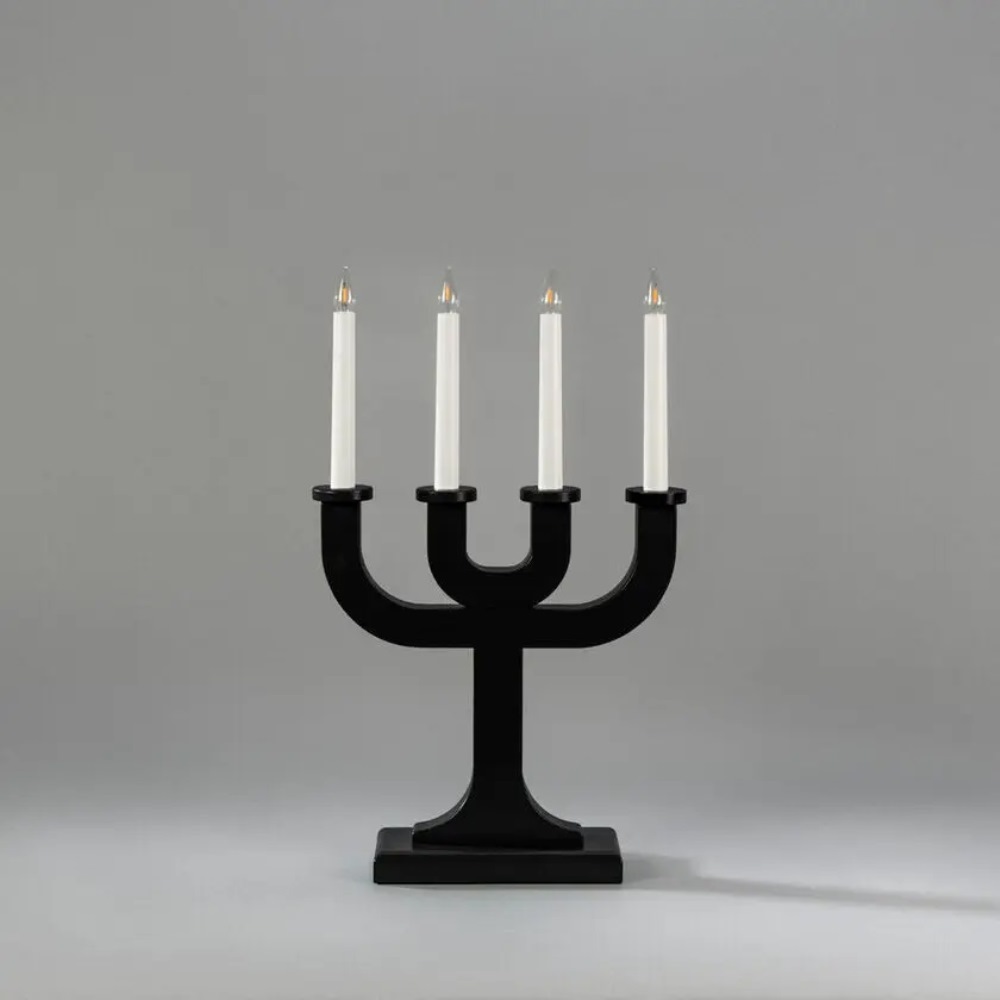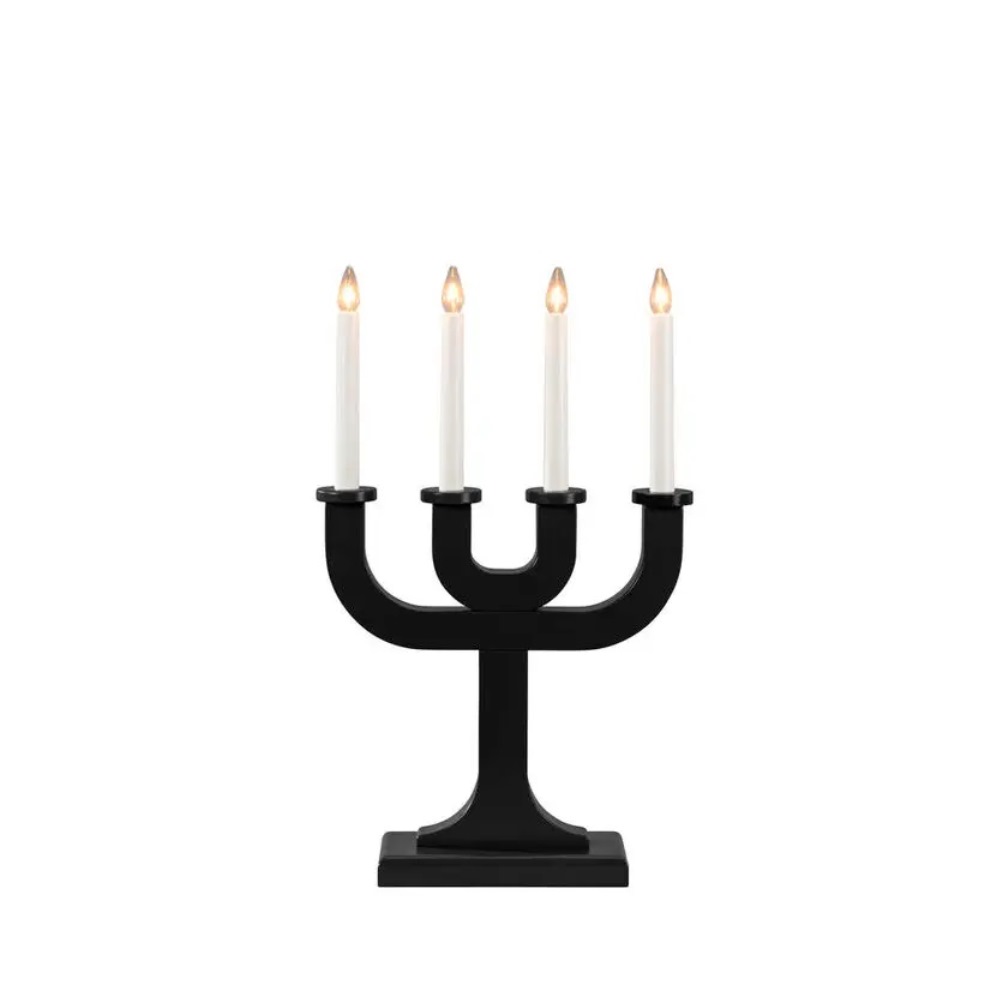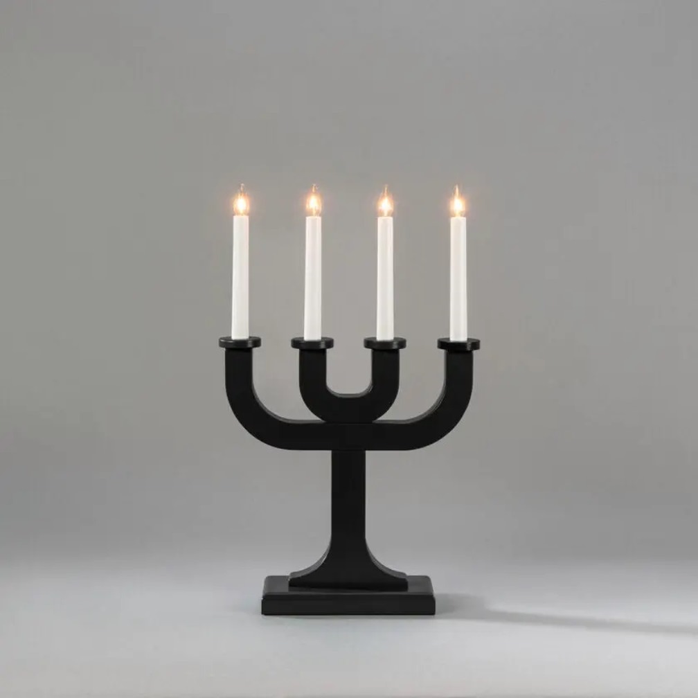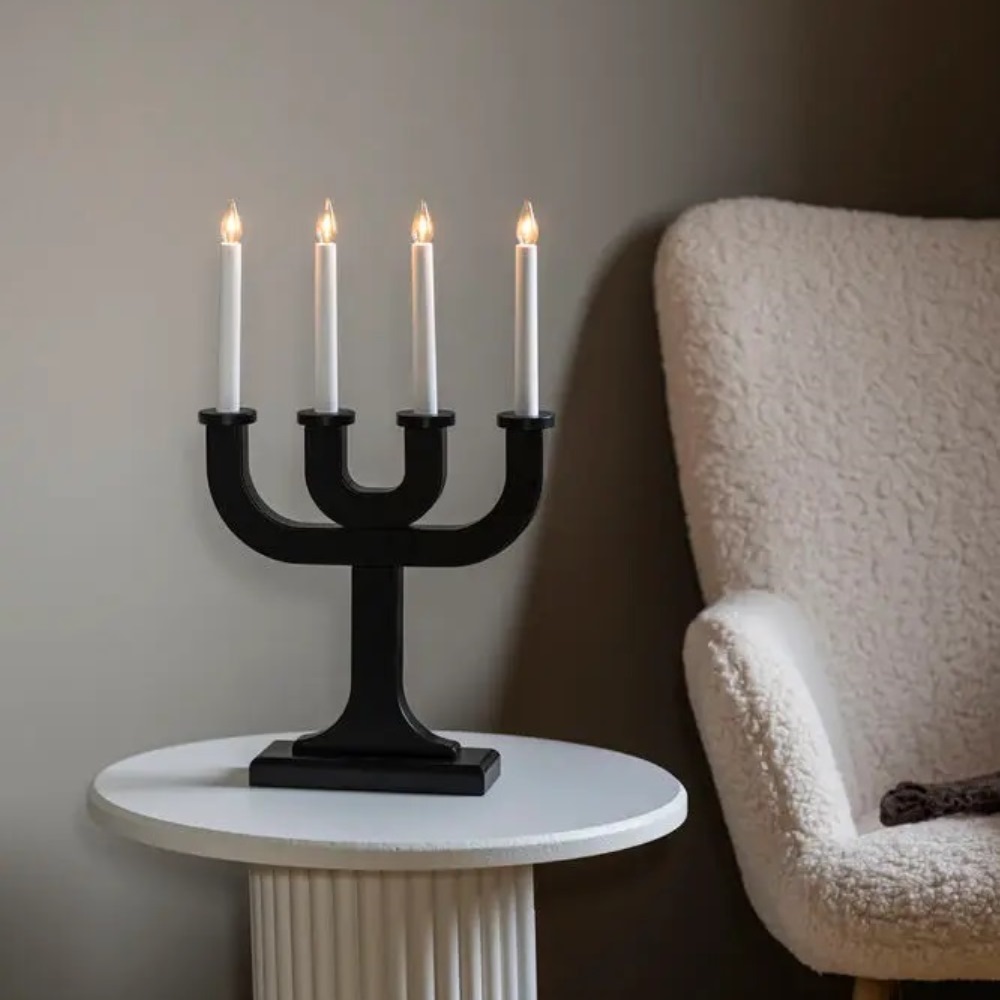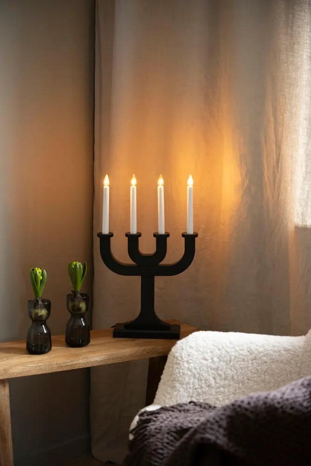 Adventsljusstake i trä, svart från Konstsmide med 4 ljus och stilren, grafisk design. Den lackade träytan skapar en vacker kontrast mot det varma ljuset och ger ett elegant uttryck som passar både klassiska och minimalistiska hem. Perfekt för att sprida mysig julstämning i vintermörkret. Den levereras med en 1,7 meter vit sladd. Ljuskälla ingår.