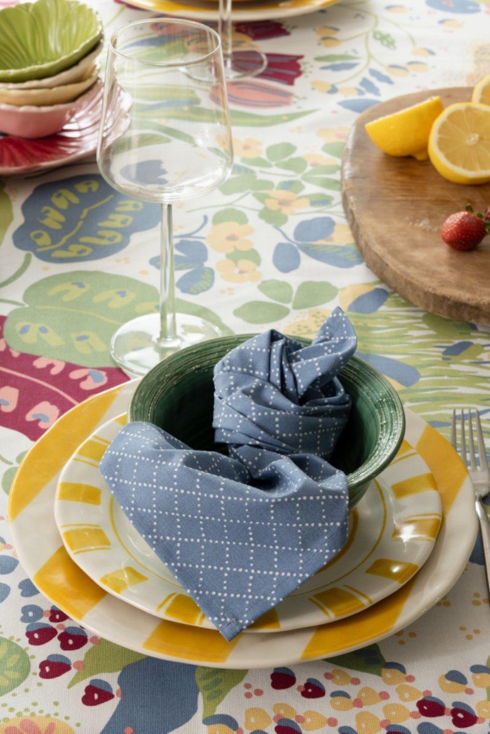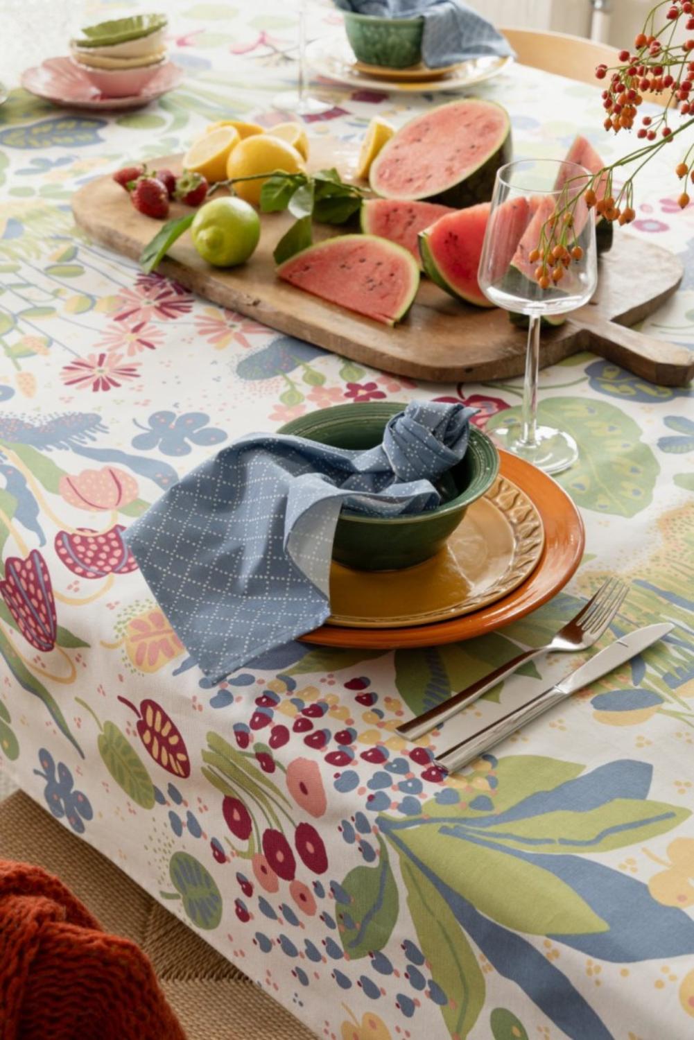 I 100% bomull med ett elegant, med vackert mönster av slingrande blad och blommor som skapar en varm, levande och tidlös känsla kring bordet.