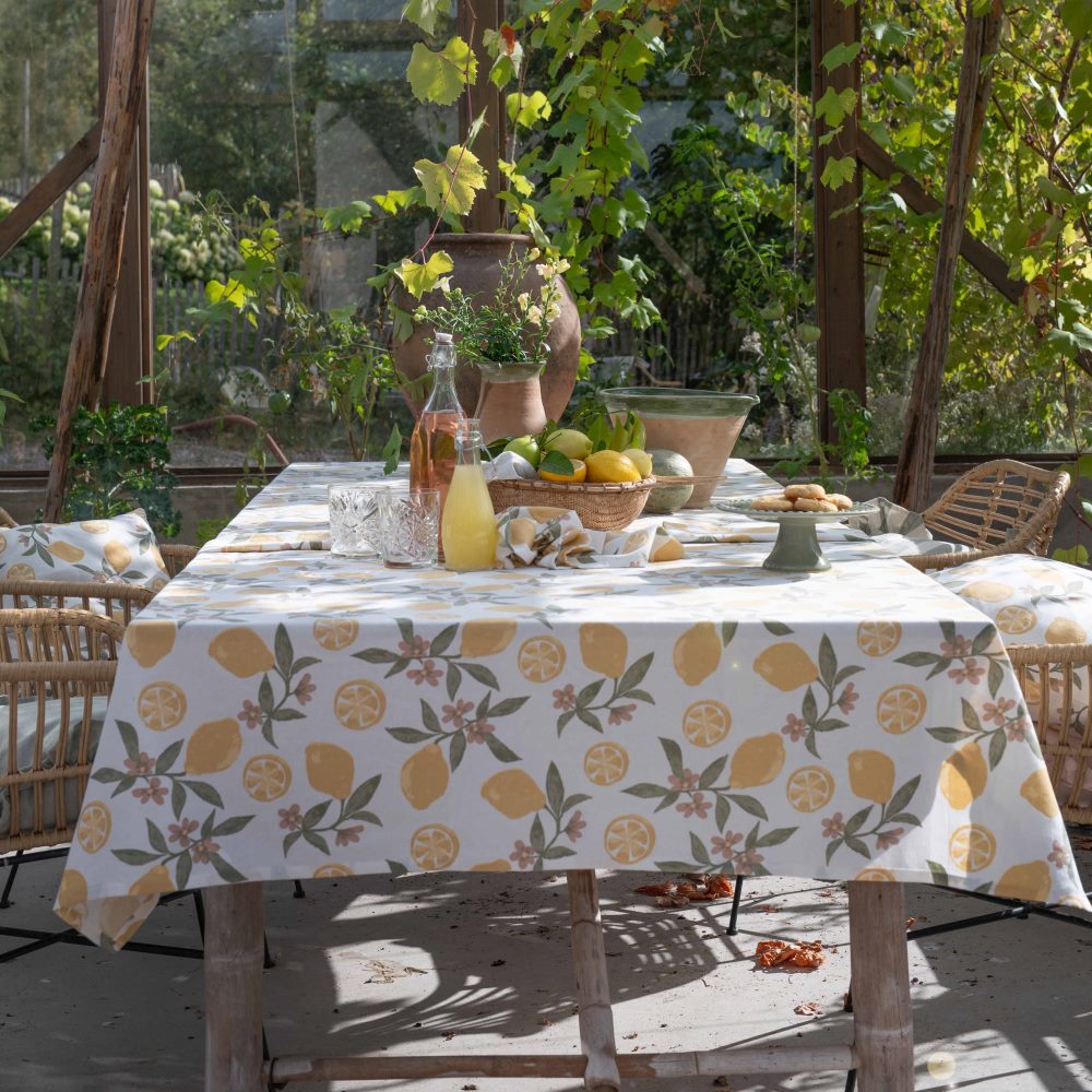 Avtorkningsbar duk Amalfi från Fondaco med ett ljuvligt citronmönster, tillverkad av återvunnen bomull och polyester. Duken är akrylatbehandlad som liknar en vaxduk, den är vattenavvisande och lätt att torka av samtidigt som den behåller en mjuk och tygliknande känsla. Storlek: 140x250 cm.