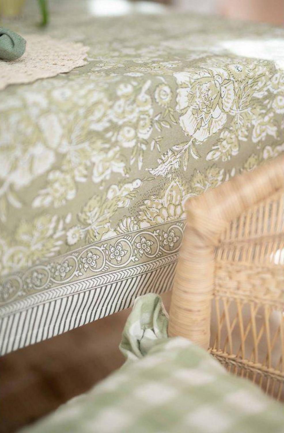 Textilvaxduk Sonia från Fondaco med ett vackert grönt mönster som drar blickarna till sig. Den akrylatbehandlade, vattenavvisande ytan gör den praktisk och enkel att torka av, samtidigt som den behåller en mjuk och textilliknande känsla. Ett utmärkt val för en elegant och stilfull dukning. Storlek: 140x250 cm.