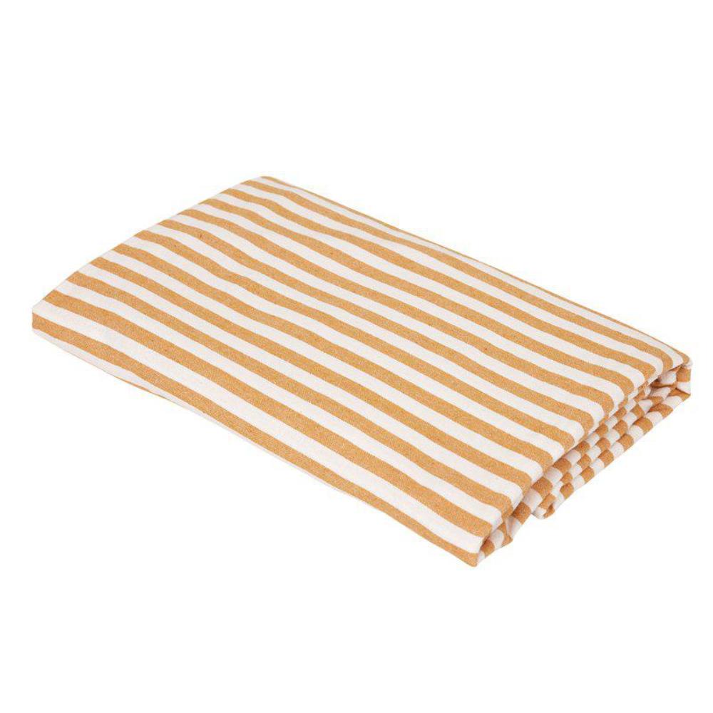 Avtorkningsbar duk Svea från Fondaco i orange färg har en klassisk randig design och är tillverkad av återvunnen bomull och polyester. Duken är akrylatbehandlad som liknar en vaxduk, den är vattenavvisande och lätt att torka av samtidigt som den behåller en mjuk och tygliknande känsla. Storlek: 145x250 cm.