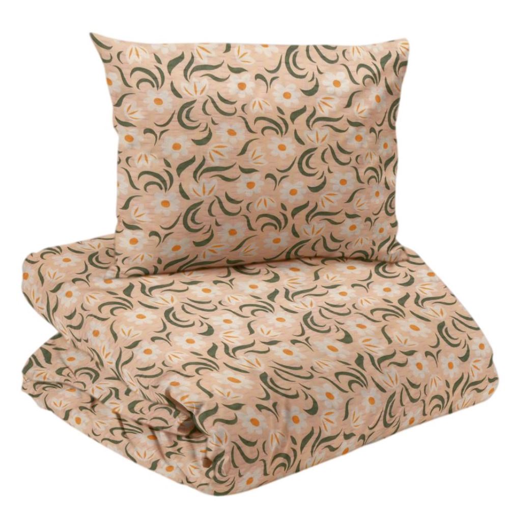 Påslakansetet har ett charmigt vitt blommönster med gröna svängda blad. Den rosa bakgrunden skapar ett harmoniskt helhetsintryck och ger sovrummet en lugn och ombonad känsla. Bäddsetet har en trådtäthet 144 TC.