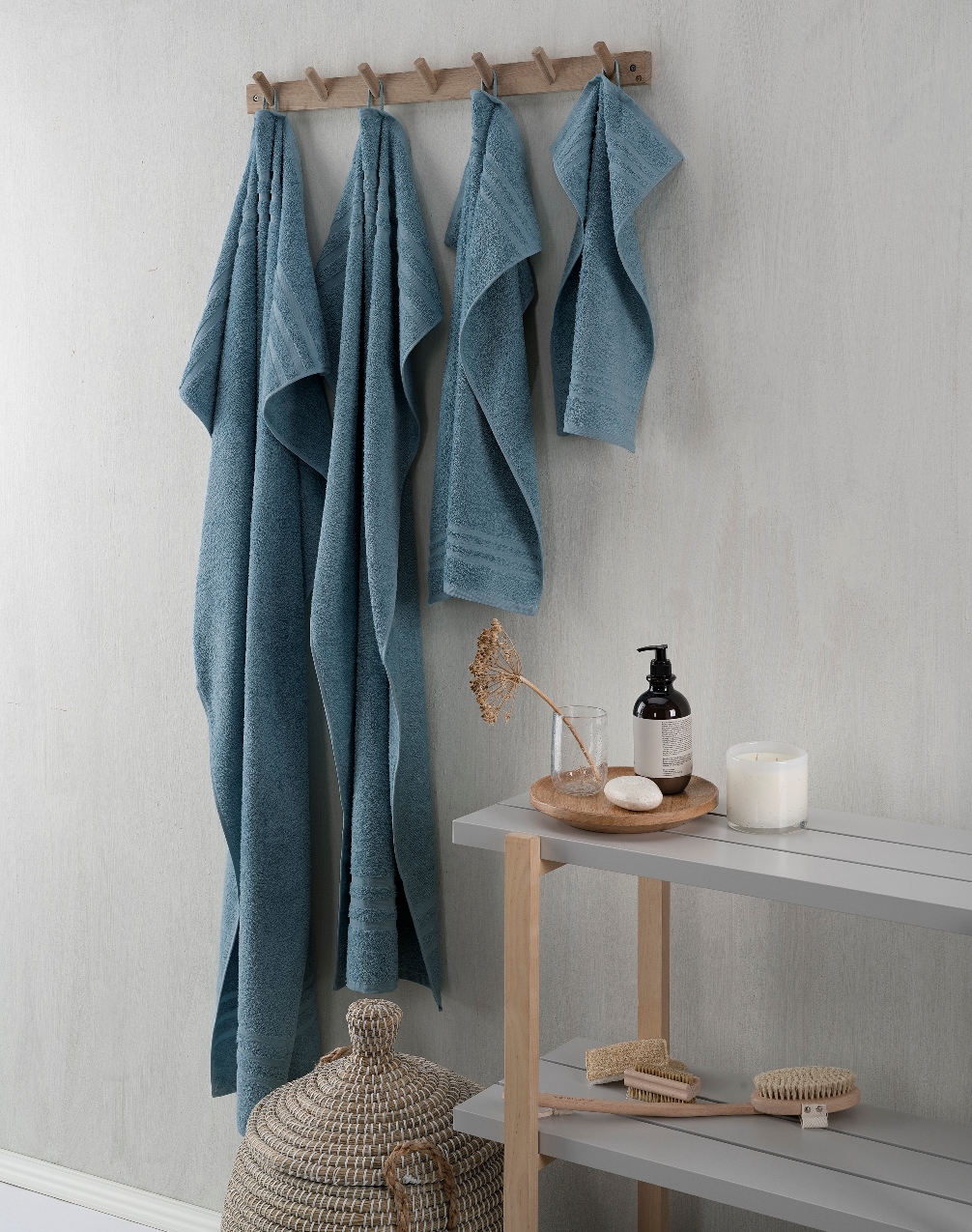 Badlakan Basic från Borganäs of Sweden är tillverkad i slät blå öglefrotté med ett klassiskt mönster i form av vävda bårder längst ner. Badhandduken har utmärkt absorptionsförmåga och finns i flera olika storlekar och färger. Den har en hängare på båda kortsidorna för enkel upphängning. Vikt: 400 g/m². Storlek: 90x150 cm.