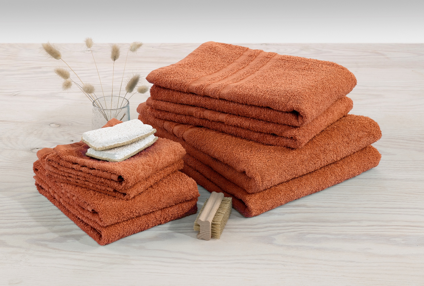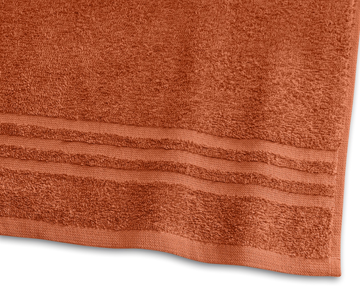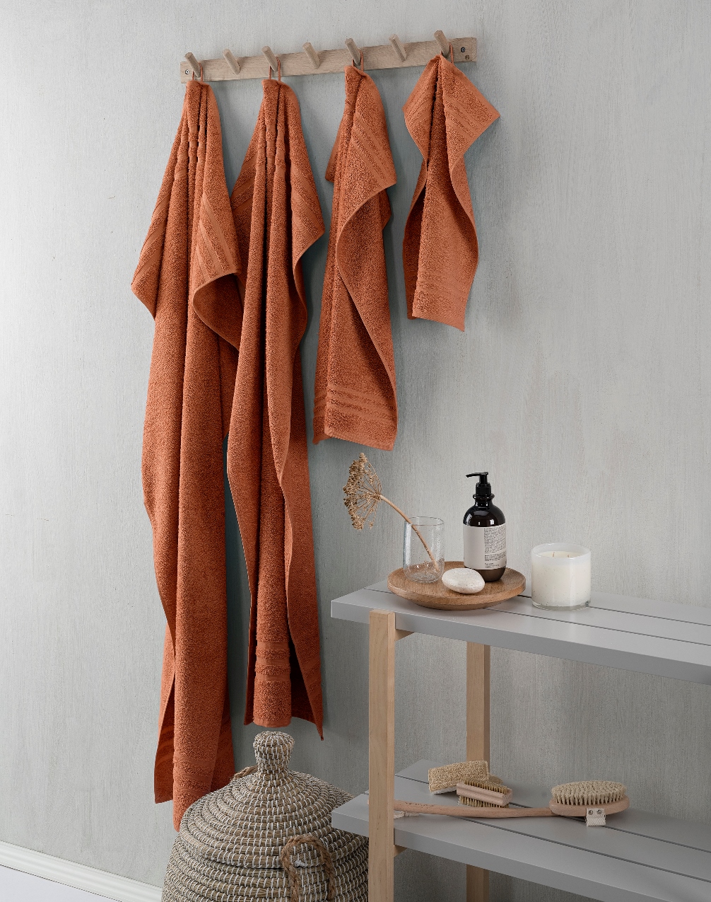 Badlakan Basic från Borganäs of Sweden är tillverkad i slät rostfärgad öglefrotté med ett klassiskt mönster i form av vävda bårder längst ner. Badhandduken har utmärkt absorptionsförmåga och finns i flera olika storlekar och färger. Den har en hängare på båda kortsidorna för enkel upphängning. Vikt: 400 g/m². Storlek: 65x130 cm.