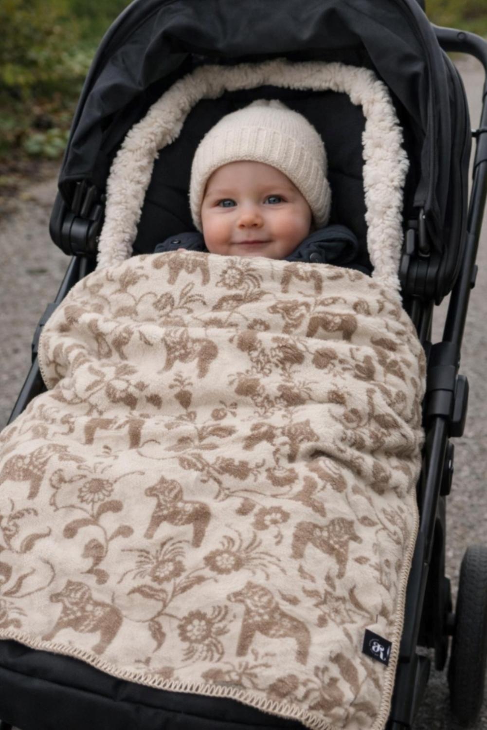 Barnfilt Leksand från Arvidssons Textil är tillverkad i 100% ull med ett vackert mönster av beige dalahästar och blommor på en ljus botten. Perfekt att använda året runt i vagnen, i barnrummet eller ge bort som en fin present. Storlek: 65x95 cm.
