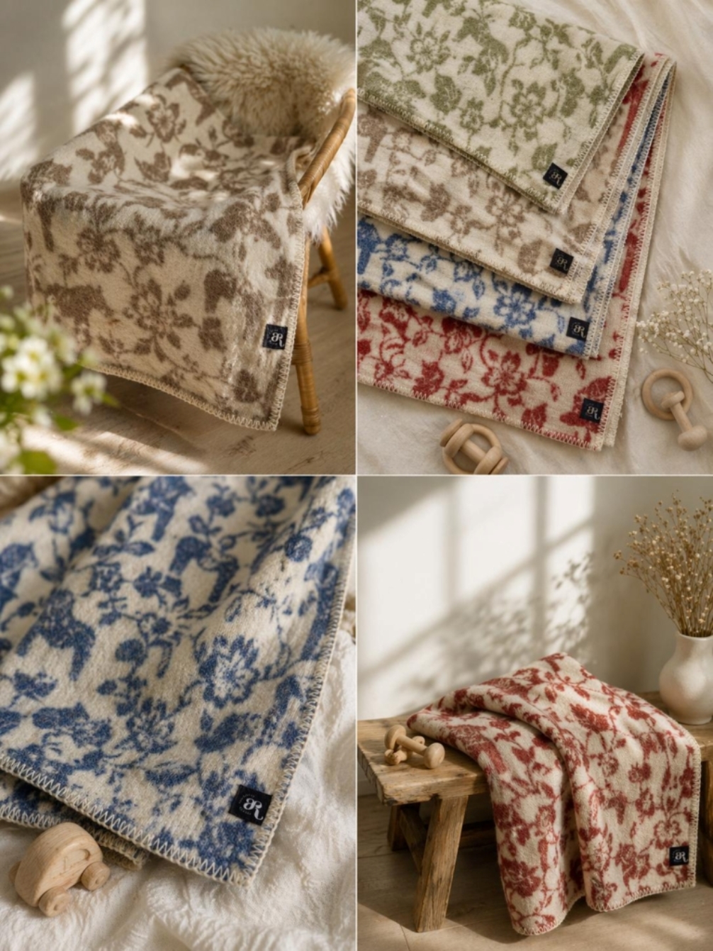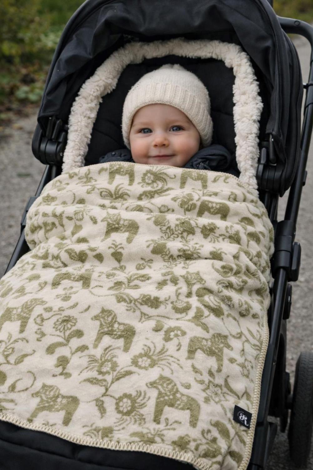 Barnfilt Leksand från Arvidssons Textil är tillverkad i 100% ull med ett vackert mönster av gröna dalahästar och blommor på en ljus botten. Perfekt att använda året runt i vagnen, i barnrummet eller ge bort som en fin present. Storlek: 65x95 cm.