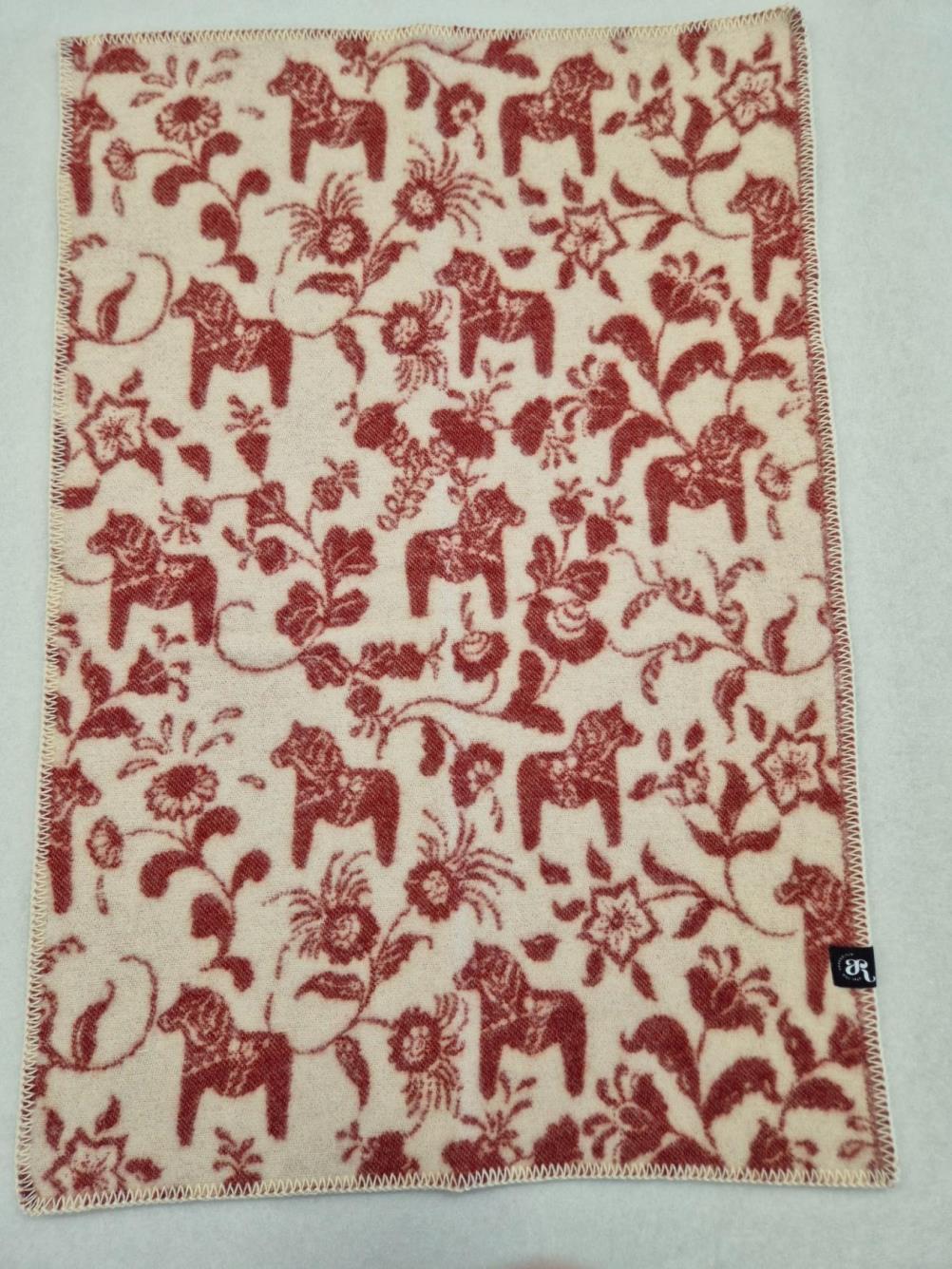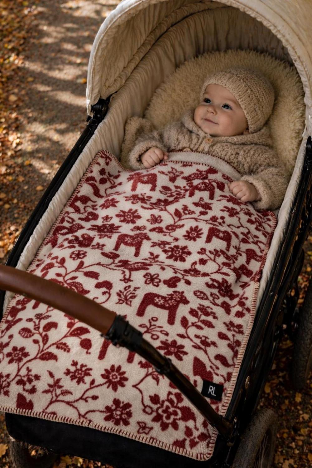 Barnfilt Leksand från Arvidssons Textil är tillverkad i 100% ull med ett vackert mönster av röda dalahästar och blommor på en ljus botten. Perfekt att använda året runt i vagnen, i barnrummet eller ge bort som en fin present. Storlek: 65x95 cm.