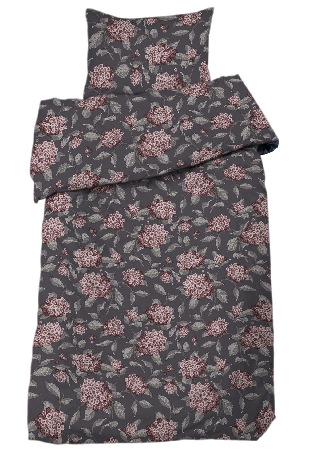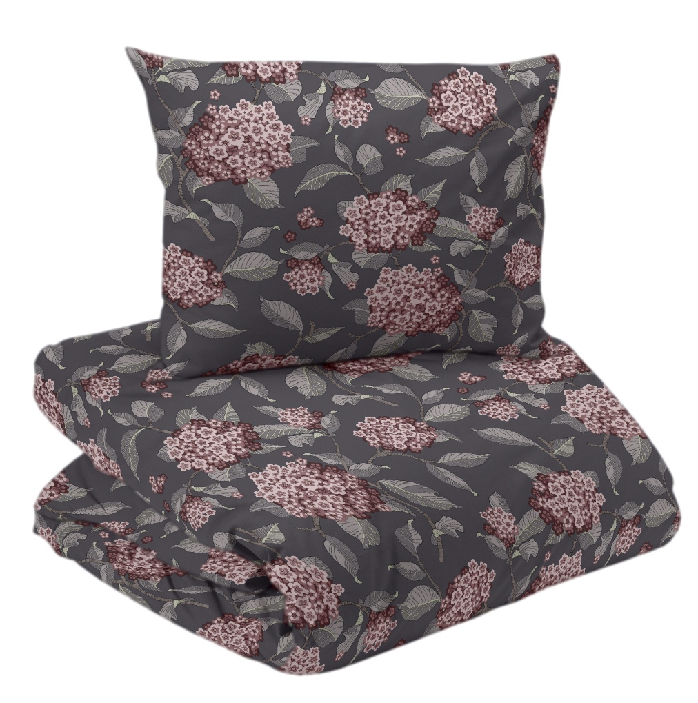 Påslakanset Casimir från Redlunds har ett elegant mönster med stora hortensior i en rosa nyans, gråa blad och slingrande stjälkar på en grå botten. Setet är tillverkat i 100% bomull med en trådtäthet på 120 TC, vilket ger en mjuk och skön känsla mot huden. Skapar en ombonad och lugn känsla i alla sovrum.