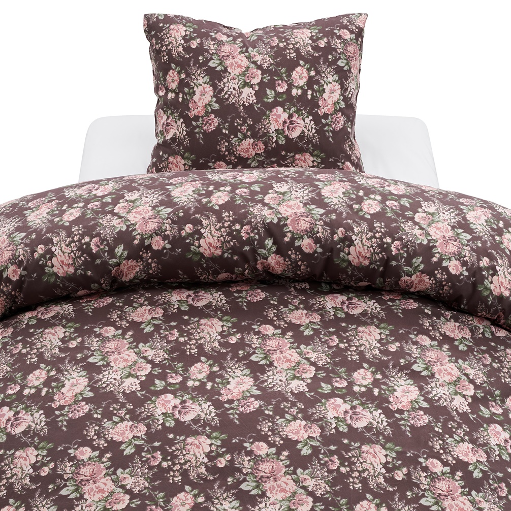 Påslakanset Penny från Harmony i mjuk microfiber har ett charmigt blommigt mönster som ger en romantisk och lantlig känsla. Den mörka bruna bakgrunden står i fin kontrast till de många små blommiga motiven i olika nyanser av rosa.