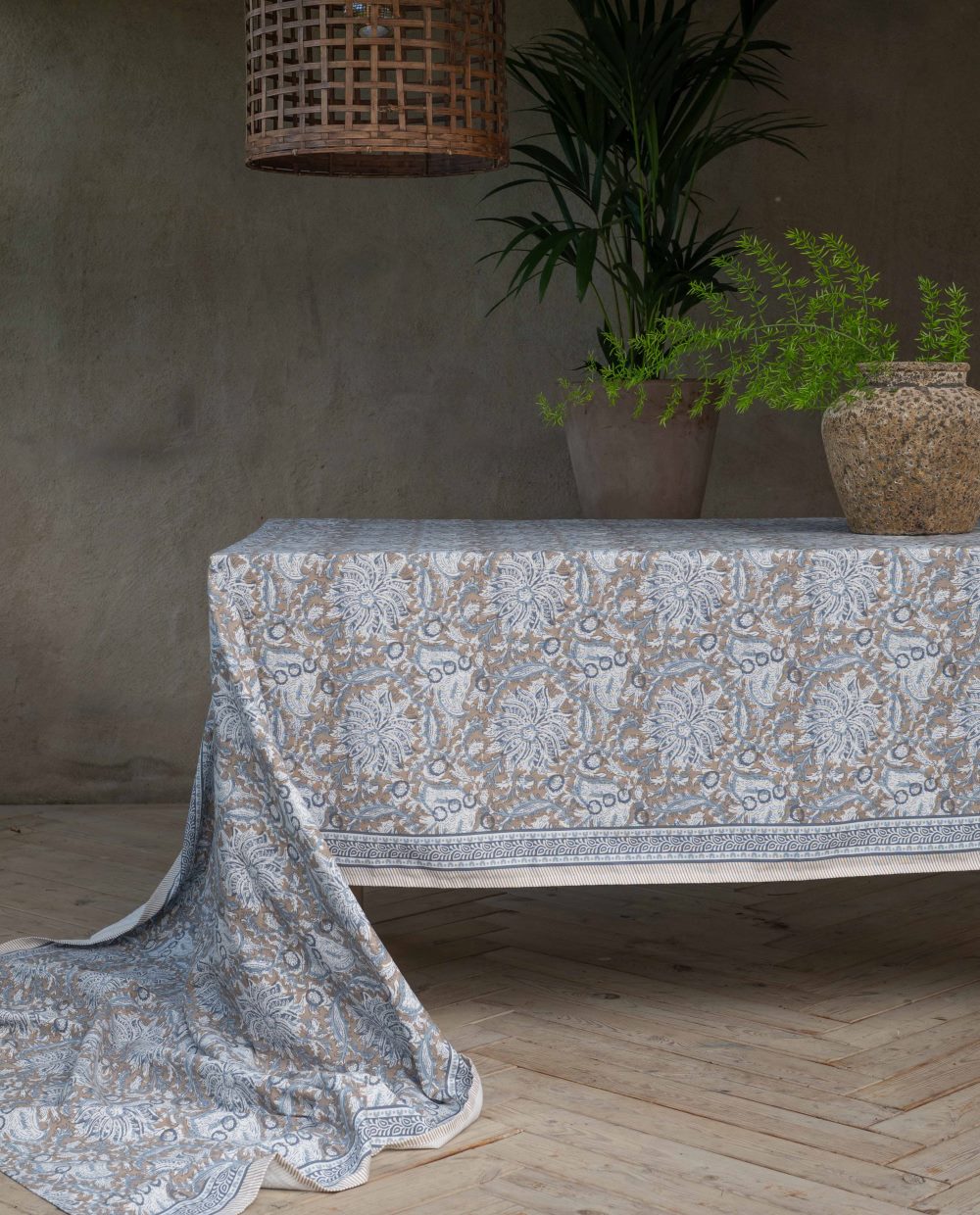 Bordsduk Dante från Fondaco är tillverkad i 100% återvunnen bomull och har en vacker blå färg som ger bordet liv och karaktär. Den vackra designen med dekorativ bård längs långsidorna och detaljerade mönster i härliga färger gör duken perfekt för både vardagsmiddagar och festliga tillställningar. Storlek: 145x300 cm.