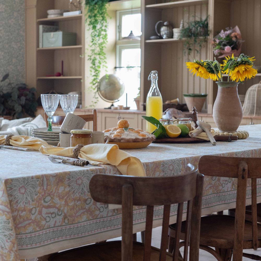 Bordsduk Dante från Fondaco är tillverkad i 100% återvunnen bomull och har en fin gul färg som ger bordet liv och karaktär. Den vackra designen med dekorativ bård längs långsidorna och detaljerade mönster i härliga färger gör duken perfekt för både vardagsmiddagar och festliga tillställningar. Storlek: 145x300 cm.