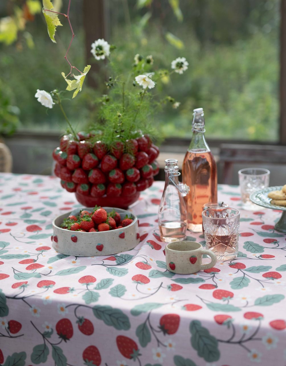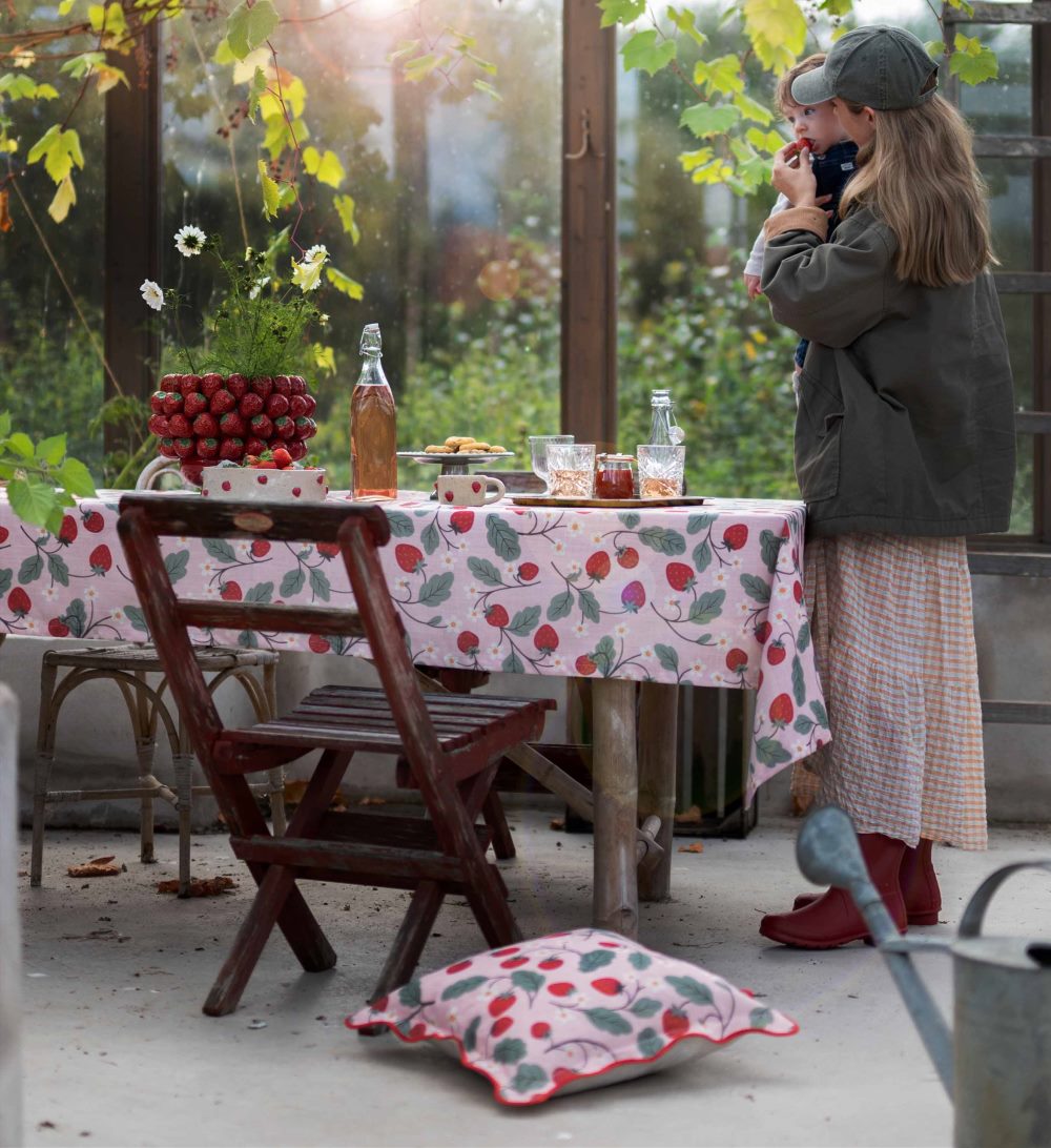 Bordsduk Jordgubbe från Fondaco är en charmig sommarduk med ett sött jordgubbsmönster som utstrålar ren sommaridyll. Duken är dekorerad med små, klarröda jordgubbar och gröna blad som ger liv åt mönstret. Bakgrunden i mjuka rosa toner skapar en lekfull och romantisk känsla, perfekt för sommarens dukningar och fikastunder. Storlek: 140x250 cm.