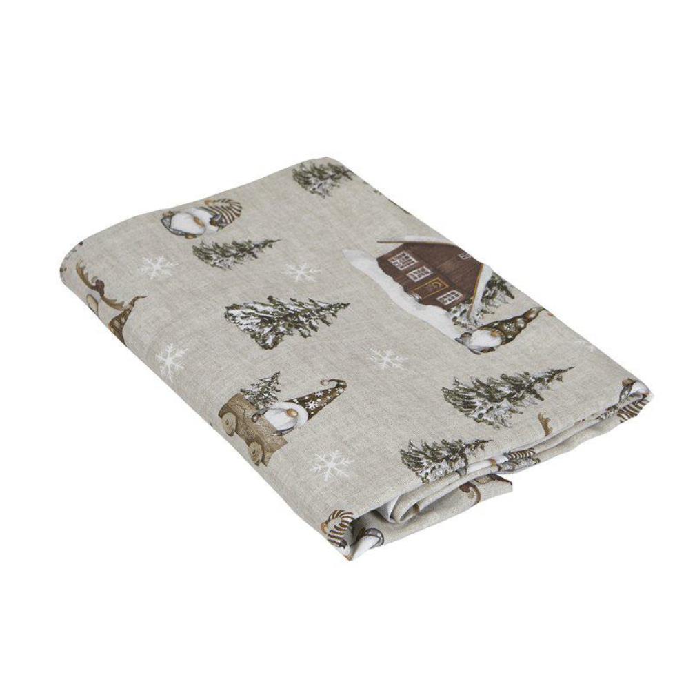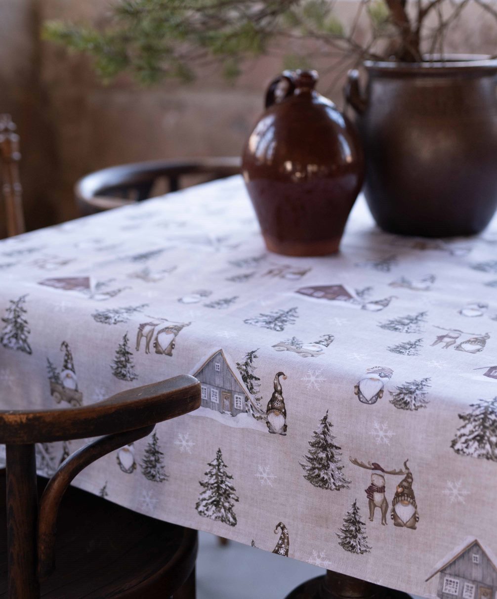 Bordsduk Harald från Fondaco i 100% bomull med charmigt julmönster av tomtar med bruna luvor och hus. Idealisk för att skapa en varm och inbjudande julstämning. En elegant detalj till julbordet. Storlek: 145x250 cm.