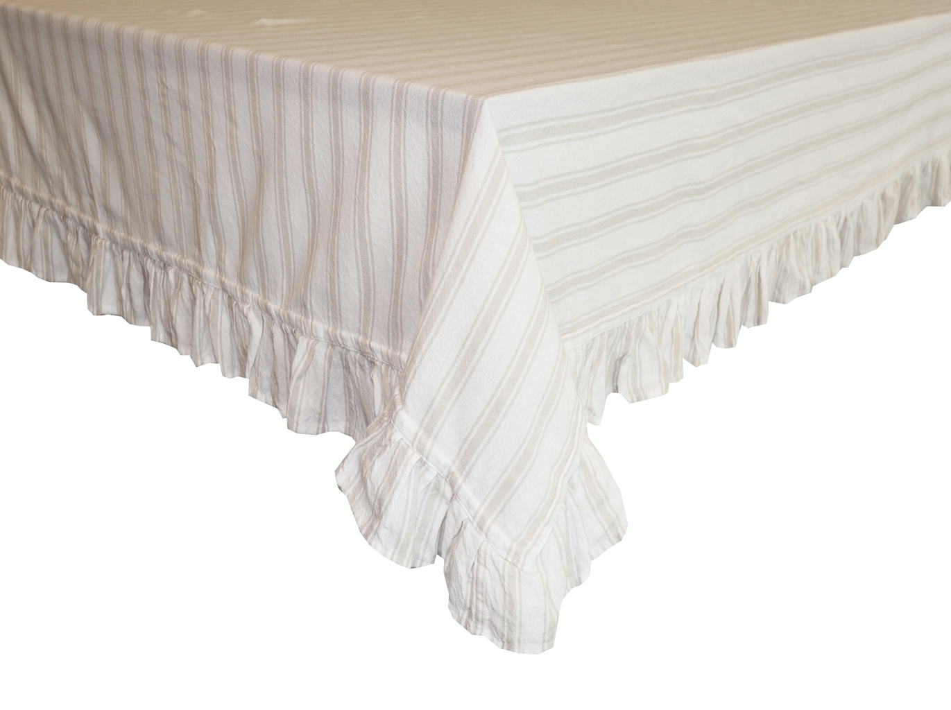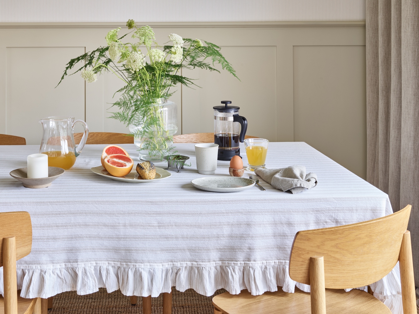 Bordsduk Madicken från Redlunds har ett tidlöst smalrandigt mönster i linnebeige och vitt. Duken är tillverkad i mjuk enzymtvättad bomull och har en vacker volangkant runt om som ger ett romantiskt och ombonat uttryck. Perfekt för att skapa en charmig, lantlig dukning med en inbjudande känsla. Storlek: 140x250 cm.