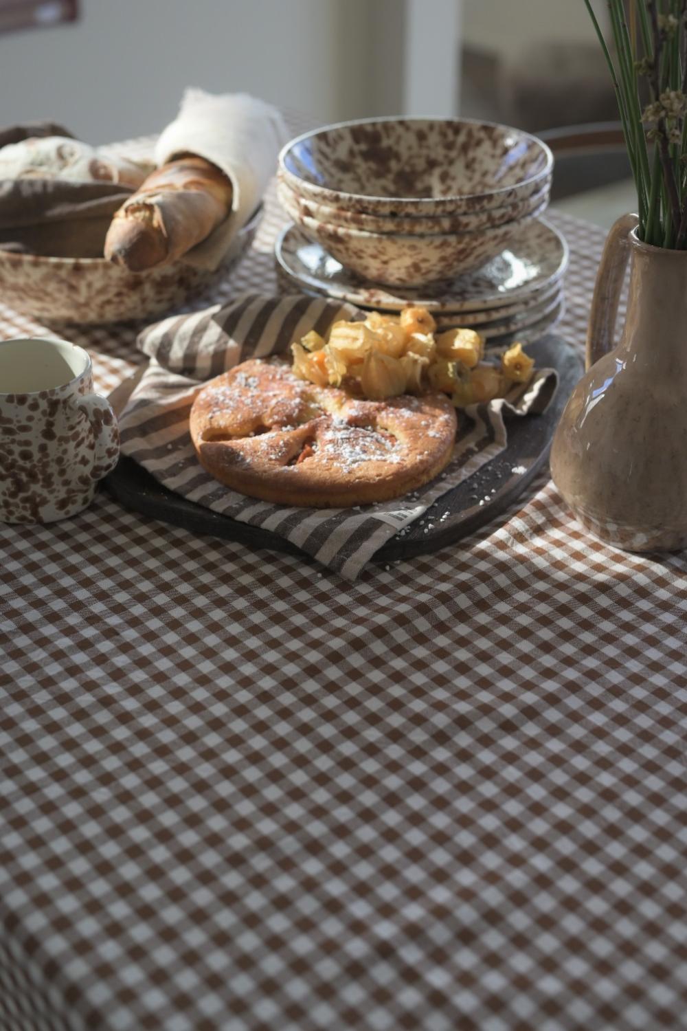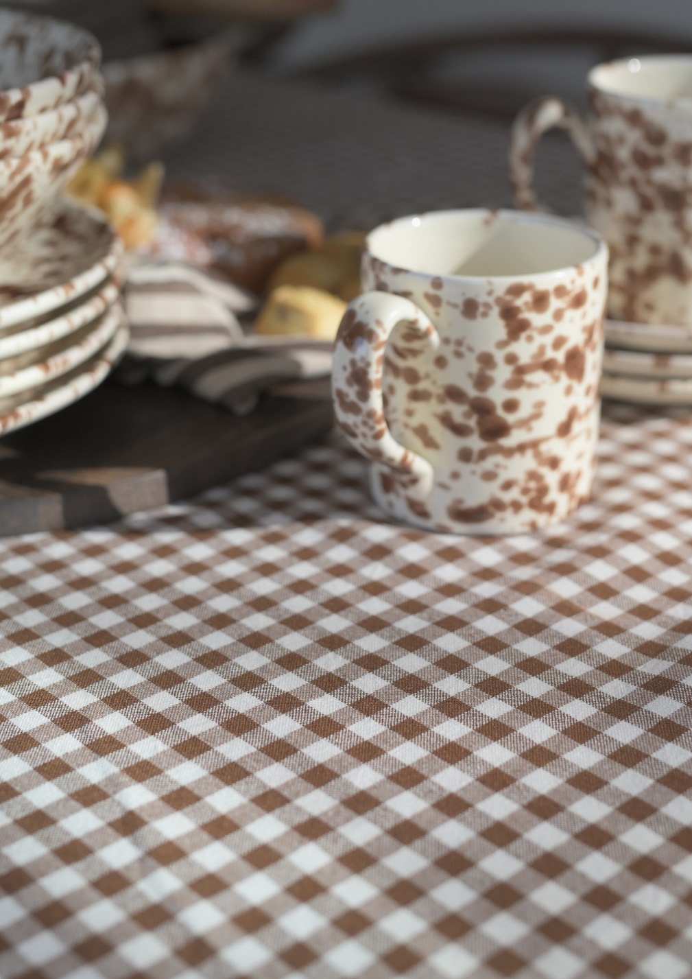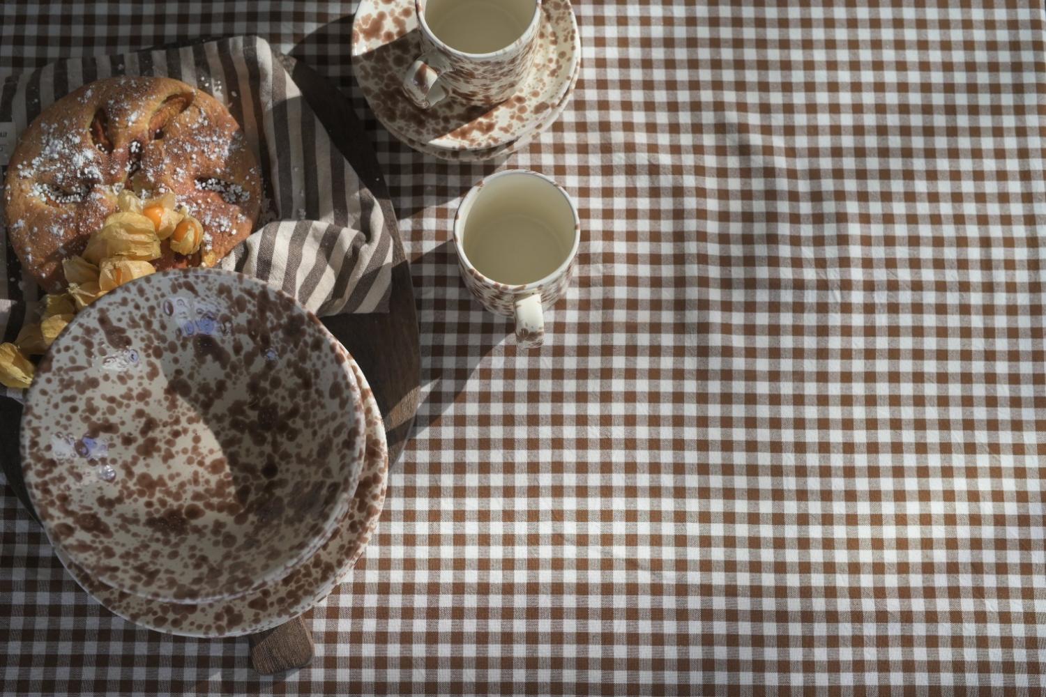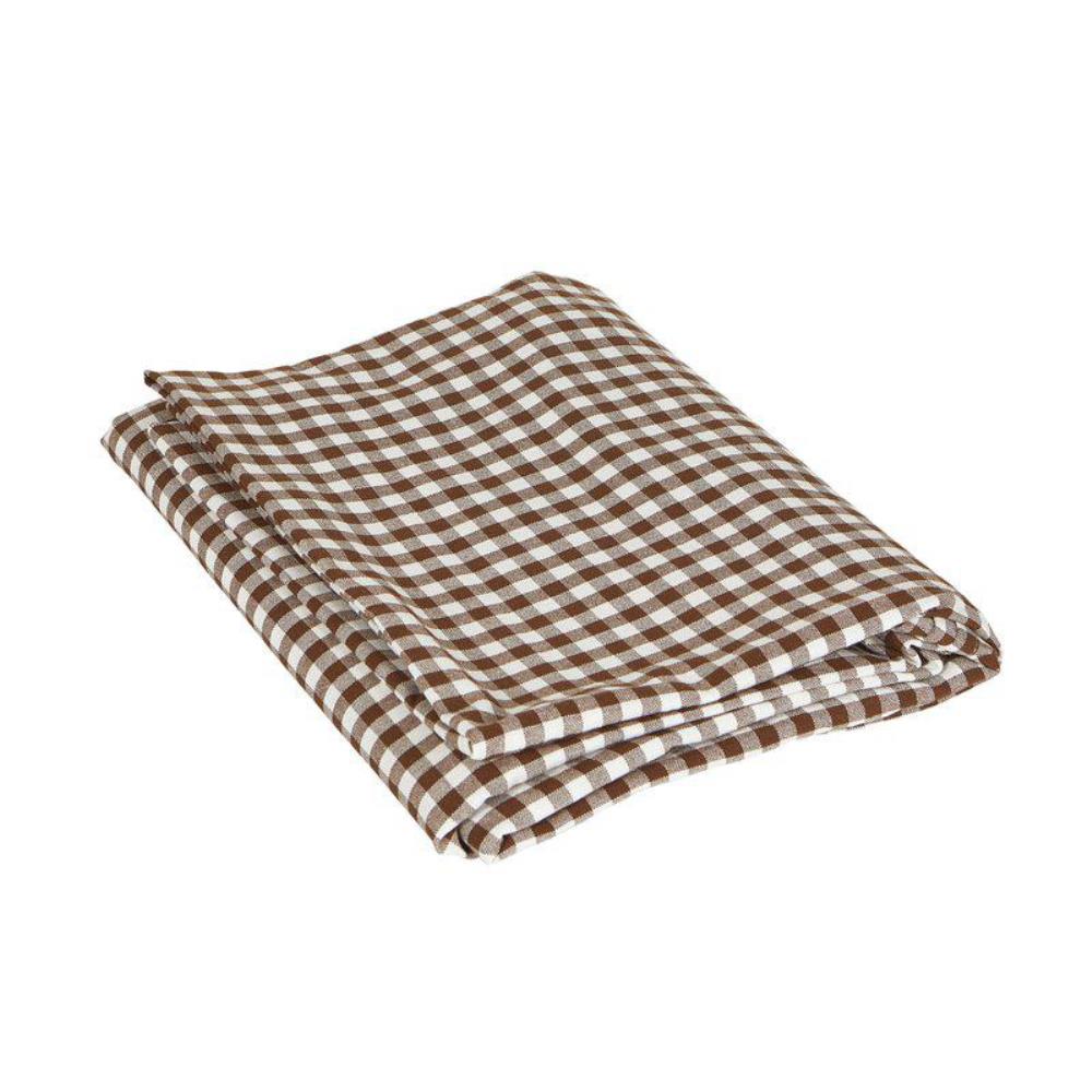 Bordsduk Freja från Fondaco med klassiskt smårutigt brunt mönster och tidlös design. De 1 cm stora rutorna bildar ett harmoniskt och välbalanserat mönster som ger en hemtrevlig känsla. Duken är tillverkad av återvunnen bomull och blir en stilren detalj som passar lika bra till vardag som till fest. Storlek: 140x300 cm.