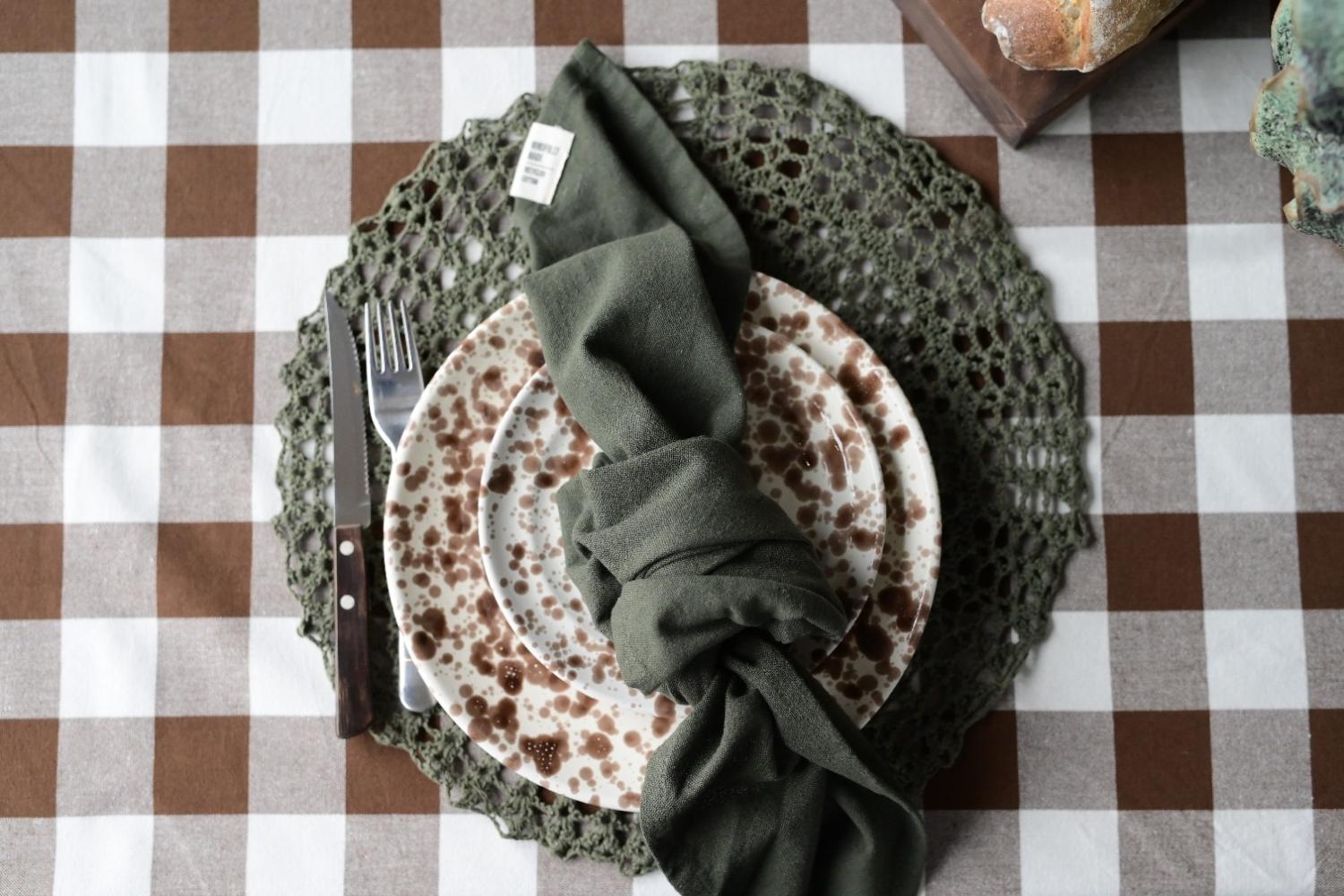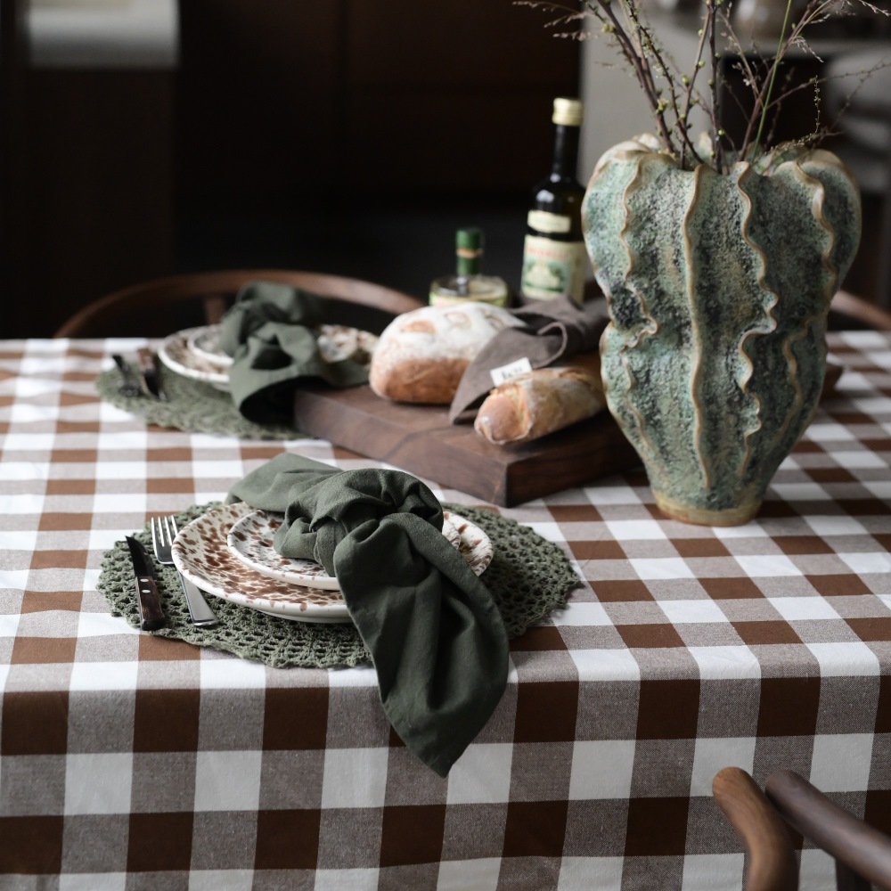 Bordsduk Moa från Fondaco i återvunnen bomull med ett tidlöst brunt rutmönster där de 4,5 cm stora rutorna skapar ett harmoniskt uttryck. Den diskreta designen ger en hemtrevlig känsla och blir en självklar del av både vardagsdukningen och festliga tillfällen. Storlek: 140x300 cm.