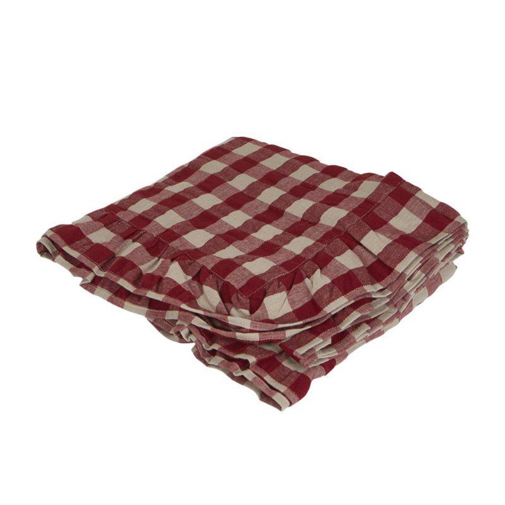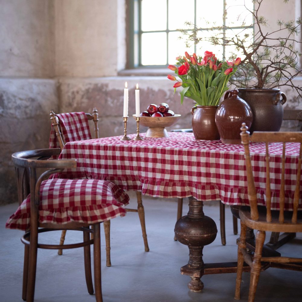 Bordsduk Lisa från Fondaco med klassiskt rött rutmönster är en tidlös och vacker detalj som förvandlar ditt matbord till en varm och inbjudande plats. Den eleganta volangen längs kanterna tillför en mjuk och charmig touch som lyfter den klassiska designen med en romantisk känsla. Storlek: 140x250 cm.