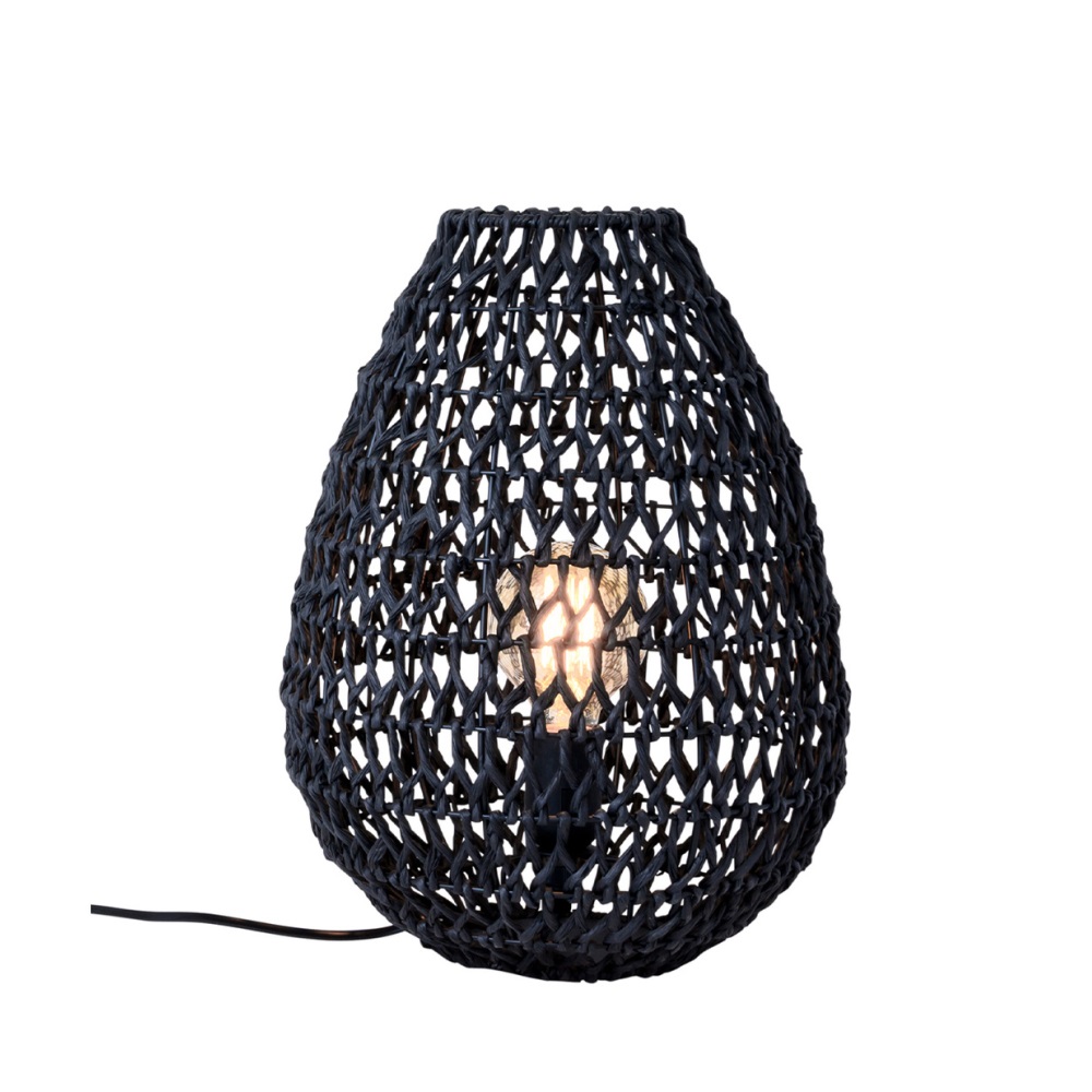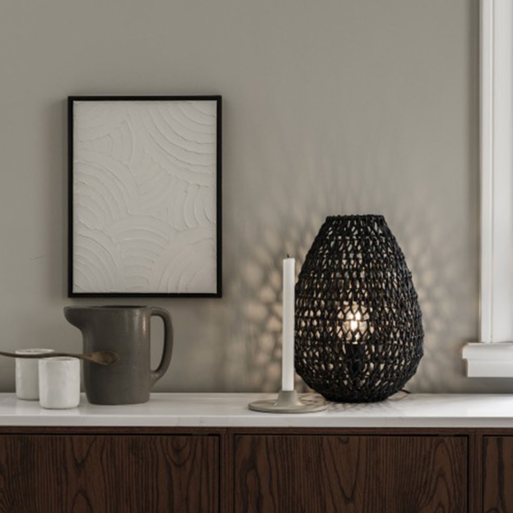 Bordslampa Buster från Watt & Veke har en vacker rund form och en stil inspirerad av naturen. Formen påminner om en urna, solid och rumslig, men samtidigt lätt i uttrycket tack vare de svarta papperslindade ståltrådarna som bildar ett vackert mönster runt ljuskällan.
