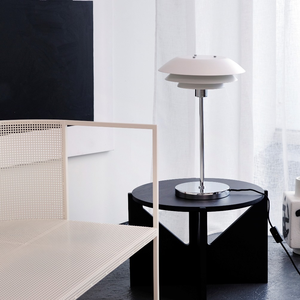Bordslampa DL31 från Dyberg-Larsen har tre vita metallskärmar som sprider ljuset vackert och skapar en trivsam atmosfär i alla rum. Den passar perfekt som läslampa, på hemmakontoret eller som indirekt belysning i vardagsrummet.