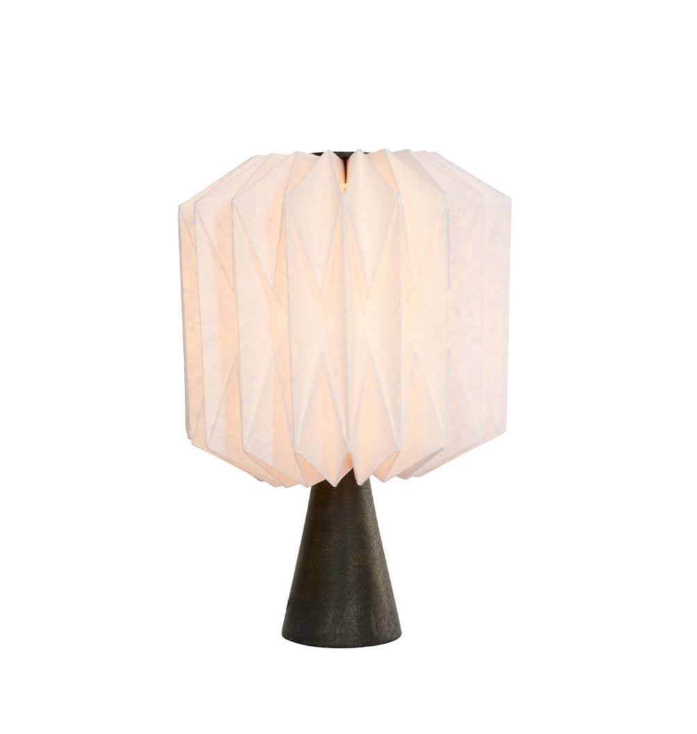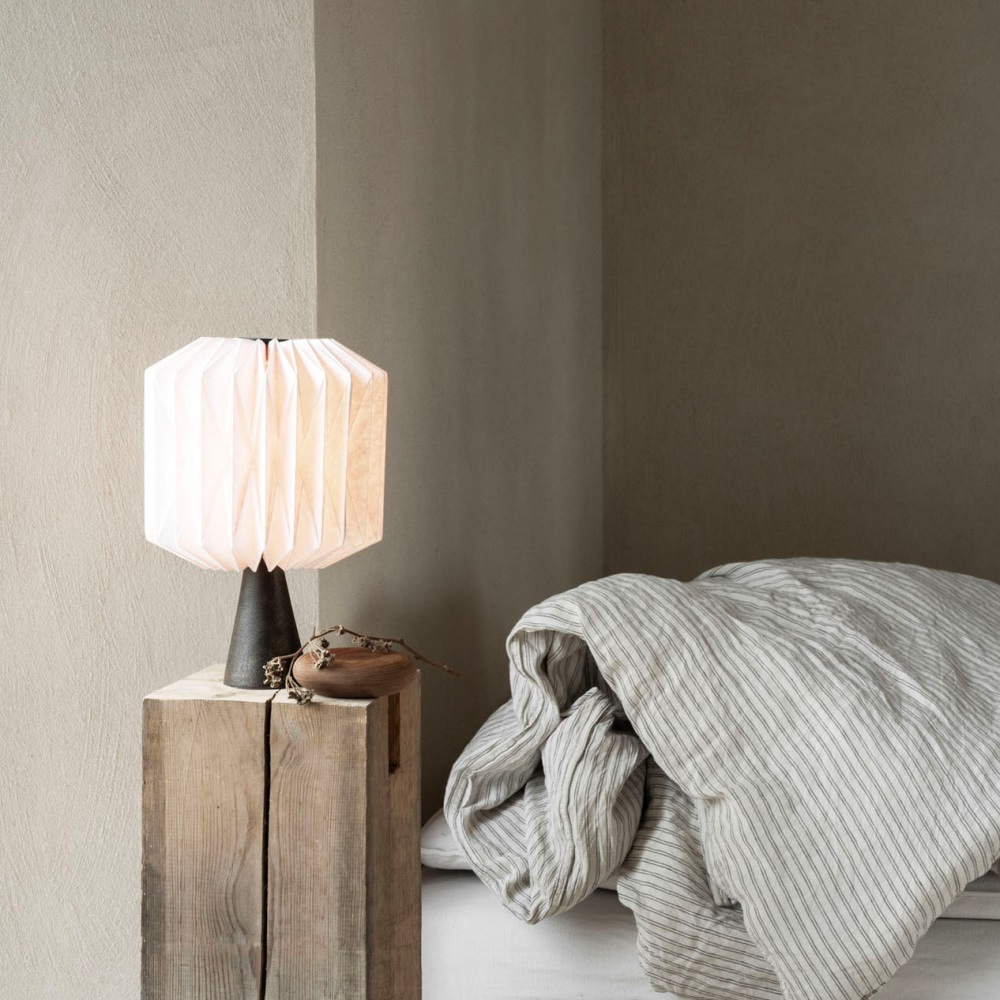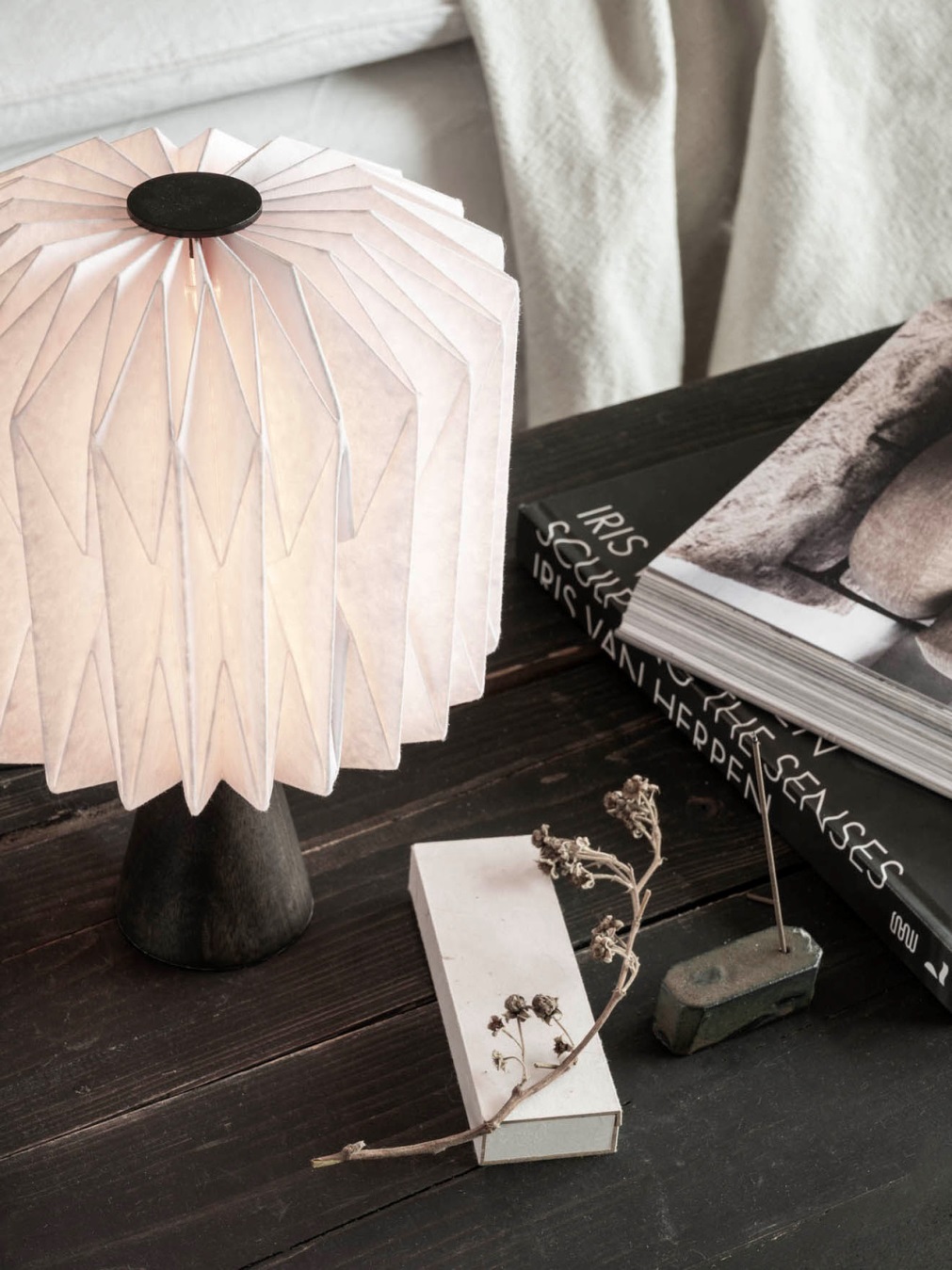 Bordslampa Fia från Watt & Veke har en liten och nätt design som kombinerar trä med en skärm av handgjort papper. Papprets unika struktur och halvtransparenta kvalitet lyser vackert när lampan är tänd, och skapar ett mjukt, behagligt sken. Varje skärm är omsorgsfullt vikt för hand, och små variationer i tjocklek och nyans gör varje lampa unik.