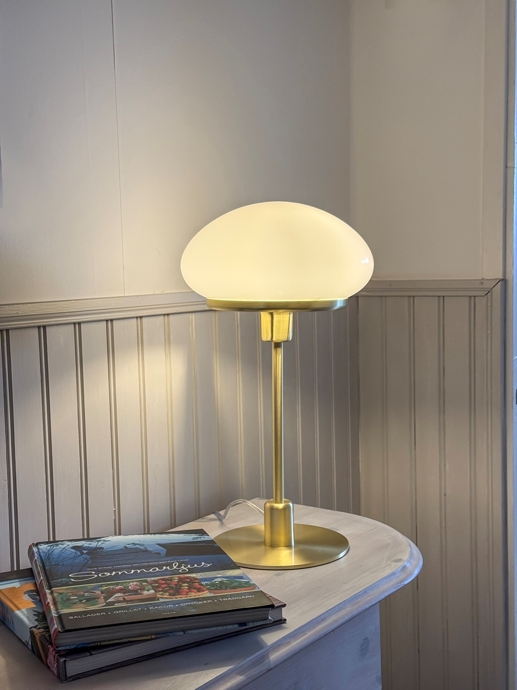 Bordslampan har en matt mässingsfärgad metallfot och en blank vit glaskupa som ger rummet en stilren känsla. Till New August rekommenderas en ljuskälla med en E27 sockel, max 40W. Ljuskälla ingår ej.