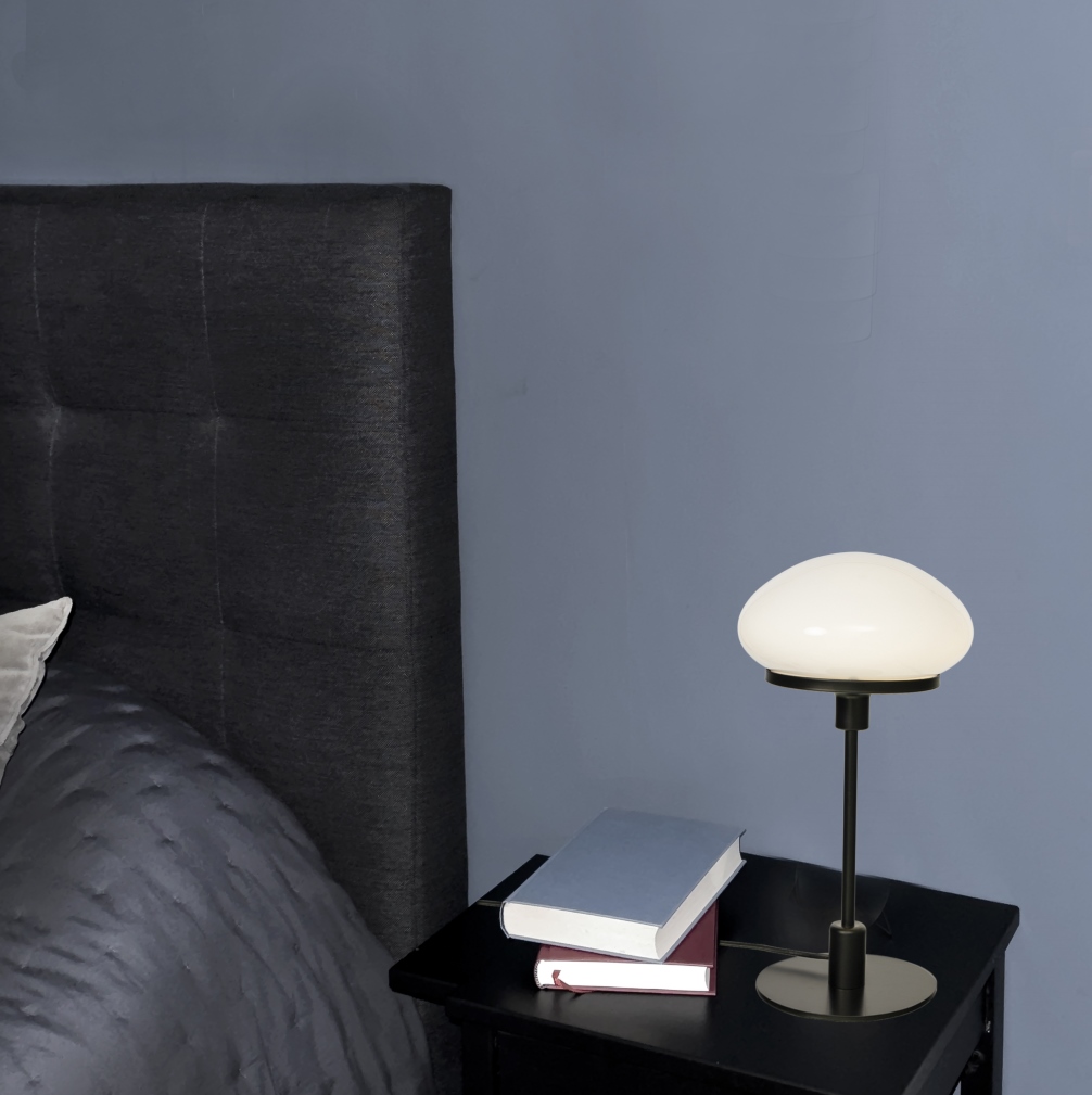 Bordslampan har en svart metallfot och en blank vit glaskupa som ger rummet en stilren känsla. Till New August rekommenderas en ljuskälla med en E27 sockel, max 40W. Ljuskälla ingår ej.