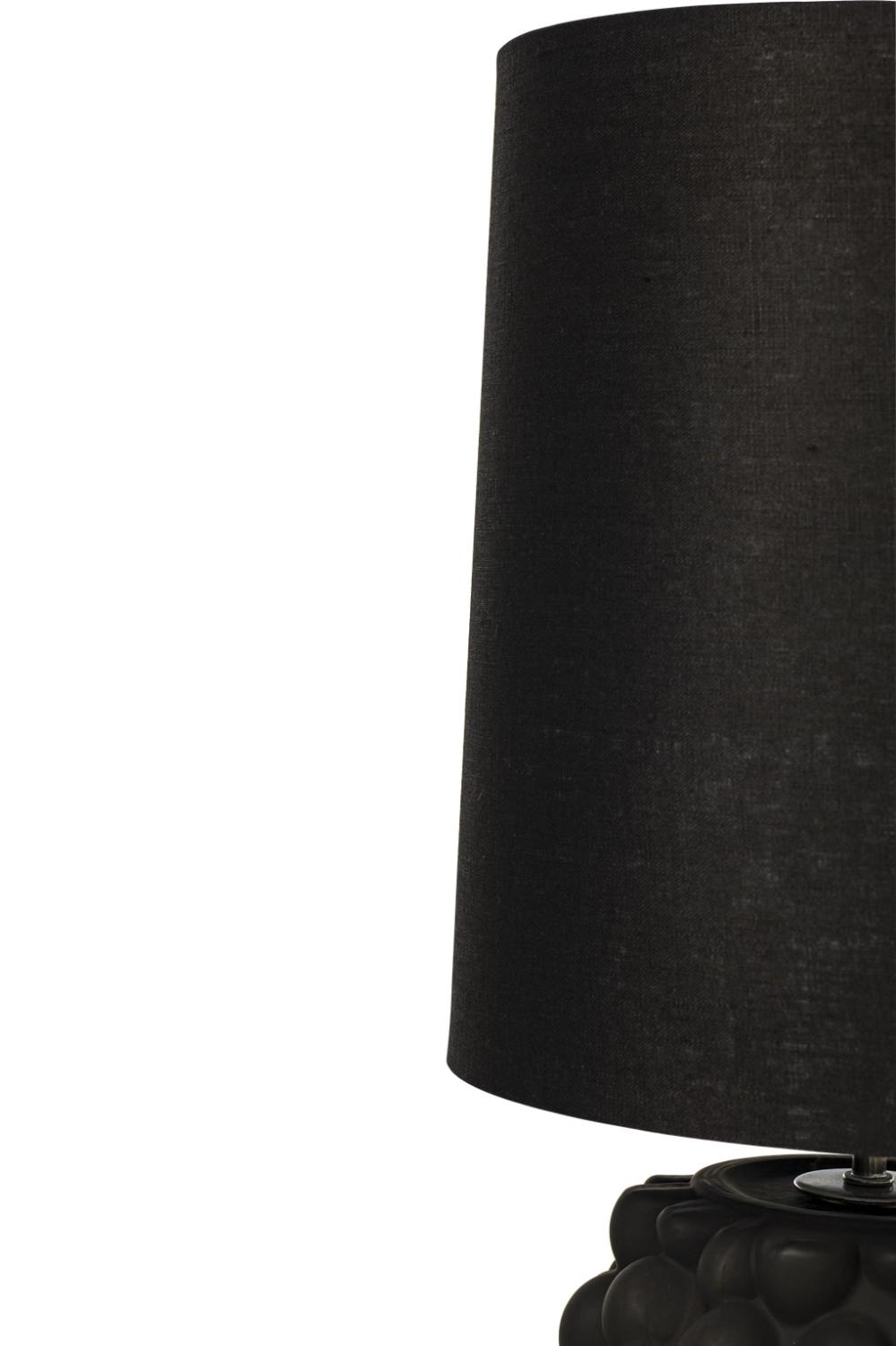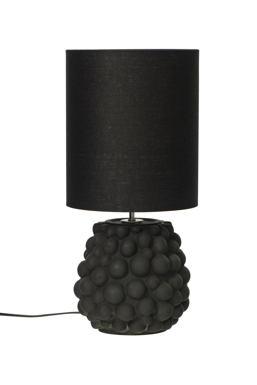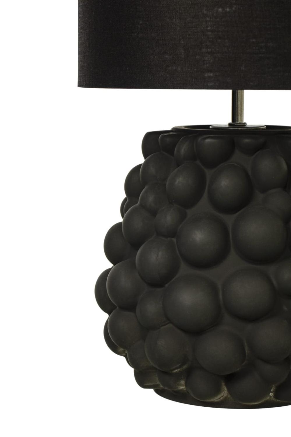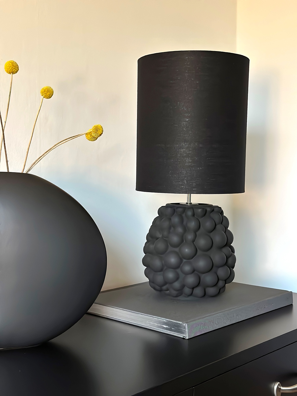 Bordslampan Bubbles från Aneta Lighting har en spännande design med en dekorativ lampfot i svart glas med textur av bubblor i olika storlekar. Den matchande svarta textilskärmen sprider ett mjukt och behagligt ljus som skapar en varm stämning i rummet. Bordslampan passar lika bra i vardagsrummet som i sovrummet och blir både en vacker och funktionell del av inredningen. Till Bubbles rekommenderas en ljuskälla med en E27 sockel, max 40W. Ljuskälla ingår ej.