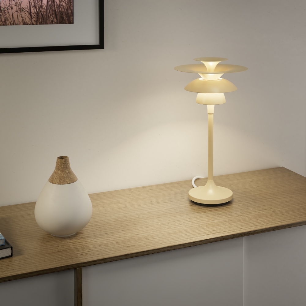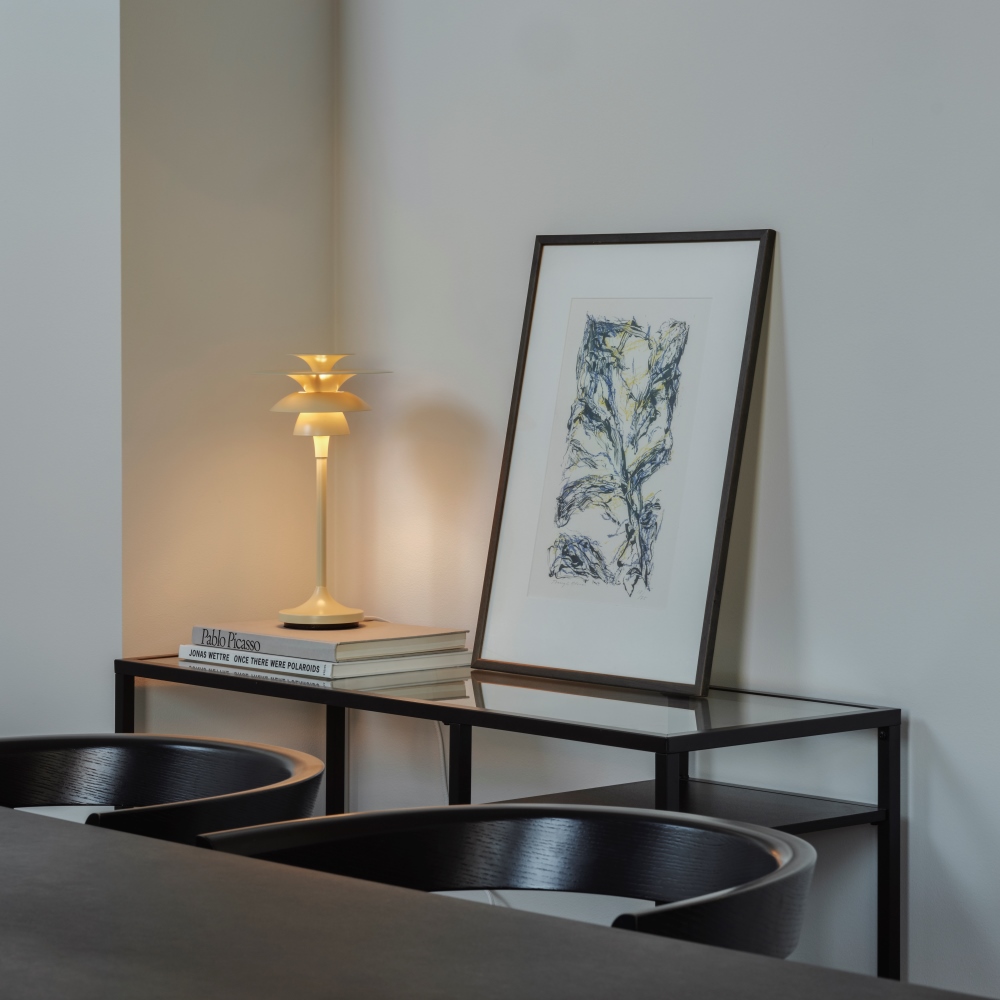 Bordslampa Picasso från Belid har en elegant och tidlös design, tillverkad i honungsgul metall. Den har flera skärmar som sprider ett jämt och mjukt ljus runt om, vilket skapar en behaglig och stämningsfull atmosfär. Perfekt för vardagsrum, sovrum eller mysbelysning i hemmets alla rum.