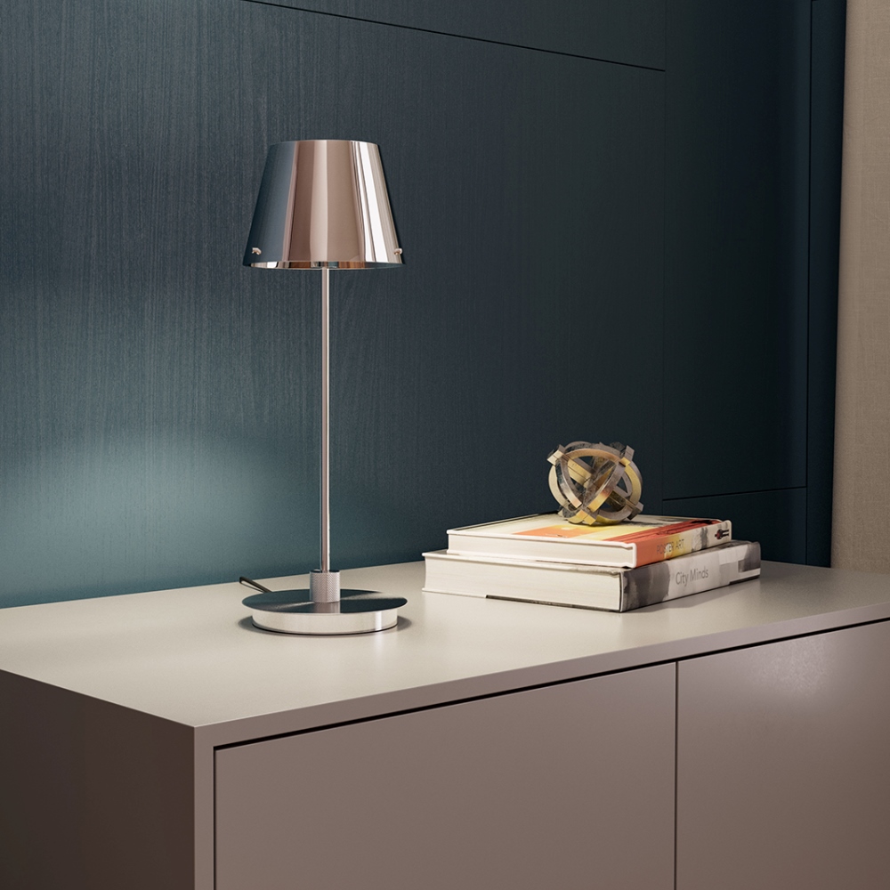 Bordslampa Gil Il Grande från Herstal har en elegant och tidlös design som utstrålar klassisk kvalitet. Med både stomme och skärm helt i metall, i en fin kromfärgad finish, får den ett stilfullt och lyxigt uttryck.