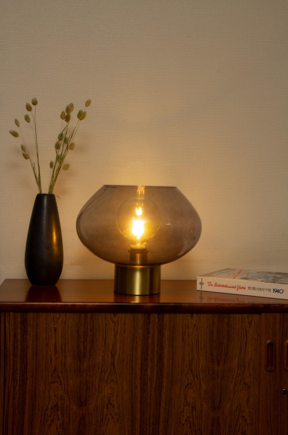 Bordslampa Bell från Aneta Lighting har en modern design med matt mässingsfärgad metall och en fin rökfärgad glasskärm. Lampan sprider ett mjukt och behagligt ljus, vilket skapar en inbjudande atmosfär i rummet. Den stilrena designen gör den till en vacker detalj som passar i många inredningsstilar. Till Bell rekommenderas en ljuskälla med en E27 sockel, max 40W. Den levereras med en 2 meter sladd med strömbrytare på sladden. Ljuskälla ingår ej.