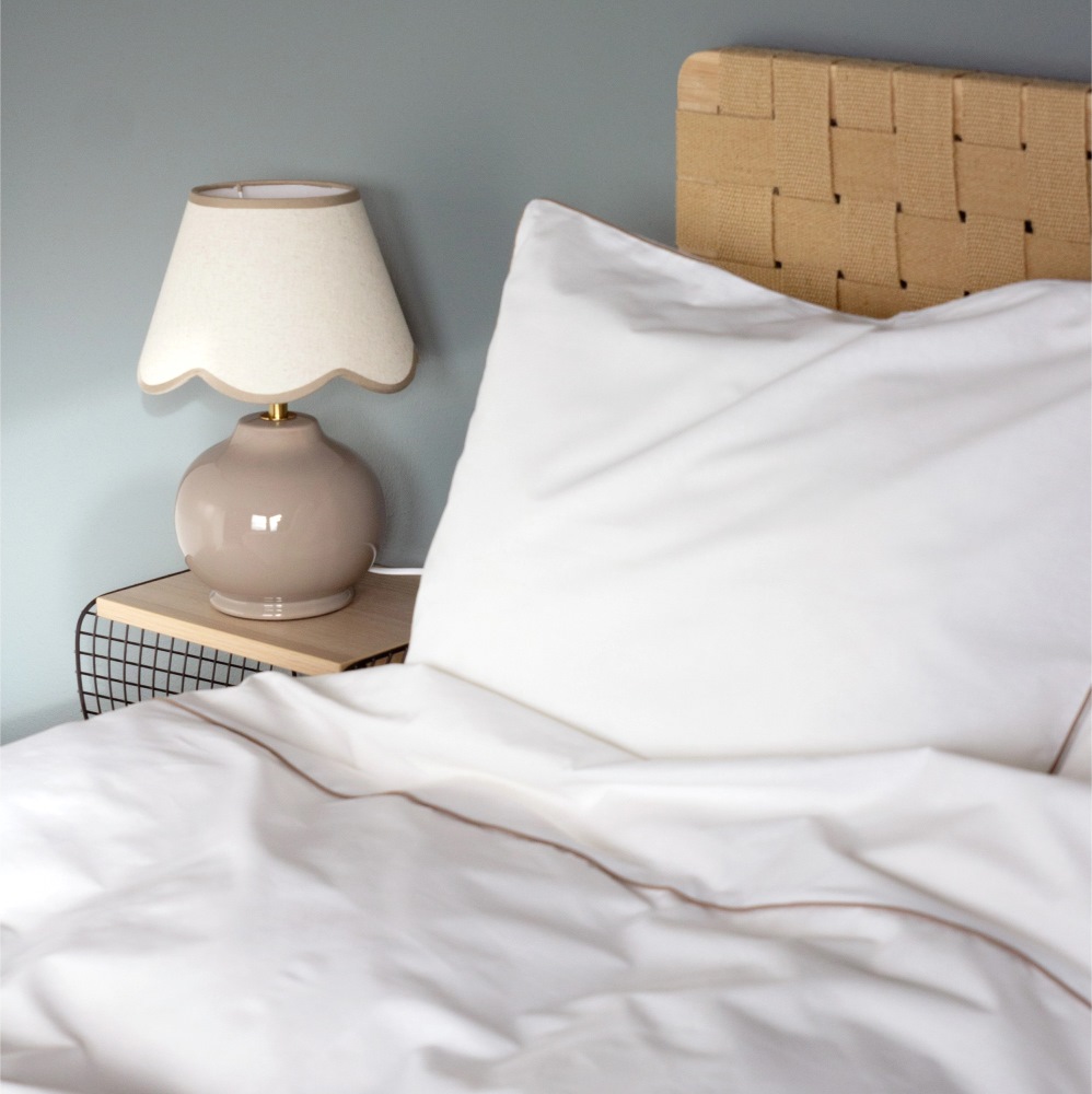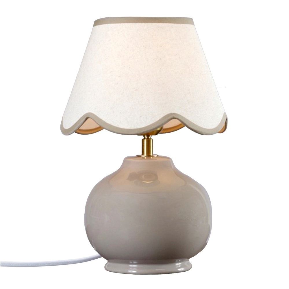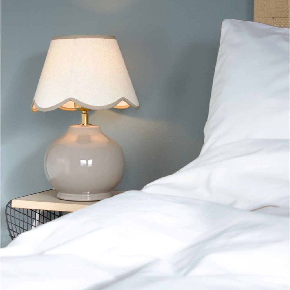 Bordslampa Nell från PR Home har en vacker klotformad design i nougatfärgad keramik och en linneliknande skärm i en mjuk ljus ton med dekorativ vågig kant. En charmig och trendig lampa som passar perfekt på sängbordet, i fönstret eller på en sidobänk.