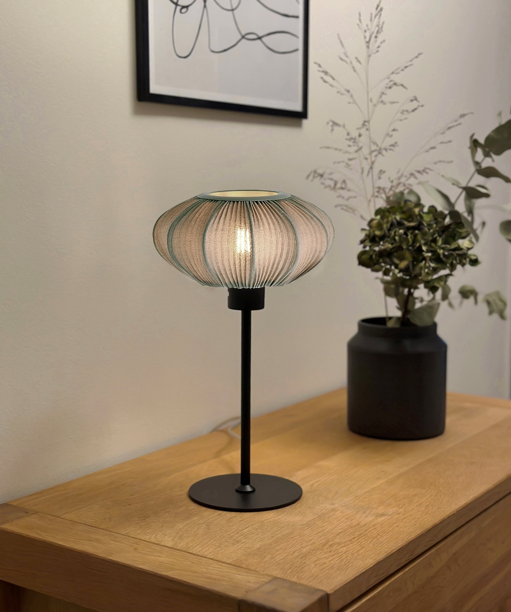 Bordslampa Mamsell från Aneta Lighting i svart metall med en skärm som är klädd i ett finplisserat grått stretchtyg som sprider ett behagligt, mjukt ljus i rummet. Låt bordslampan bli en vacker detalj på sidobordet, i fönstret eller som en stämningshöjare i sovrummet. Till Mamsell rekommenderas en ljuskälla med en ljuskälla med en E14 sockel, max 25W. Den levereras med en klar sladd. Ljuskälla ingår ej.