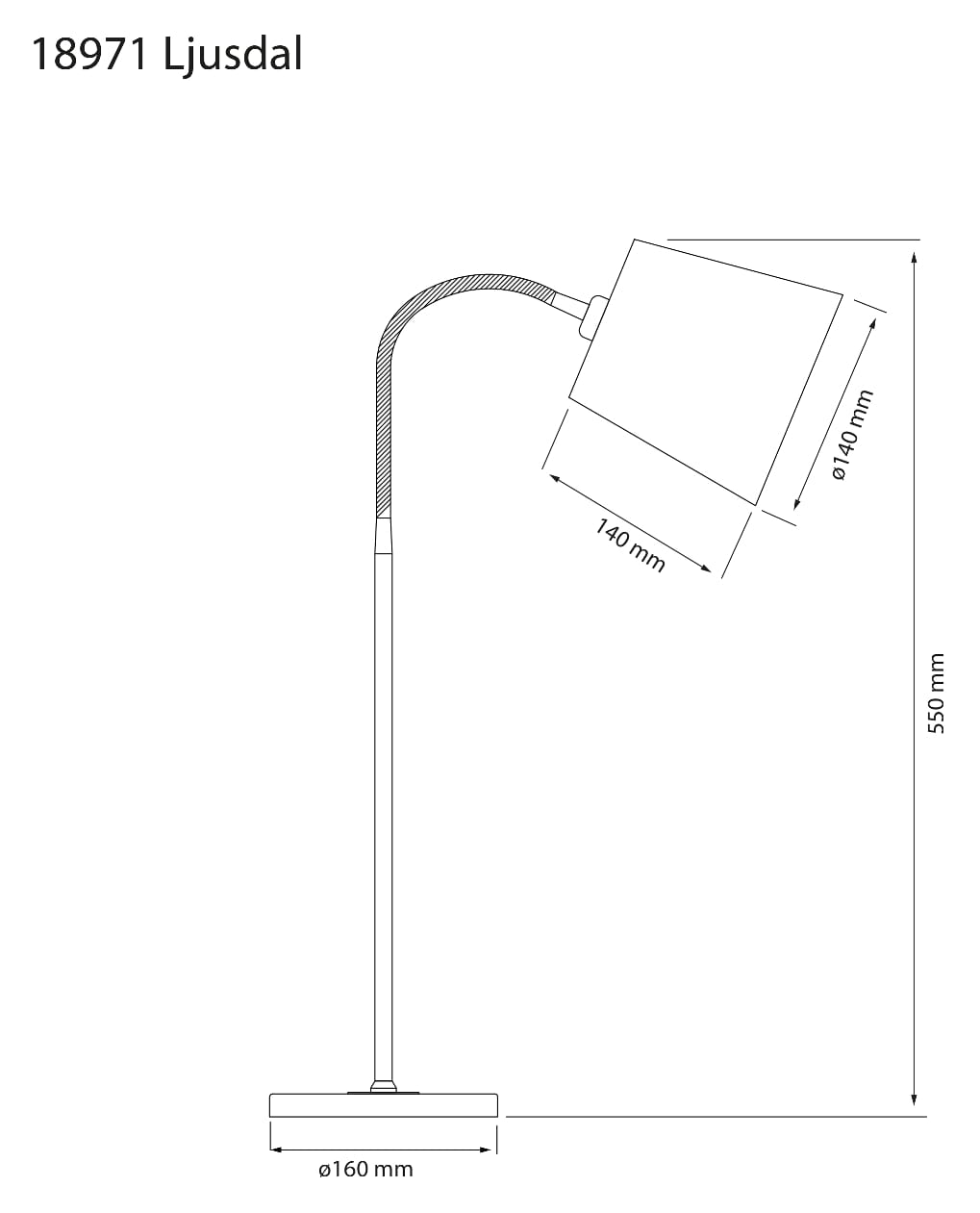 Bordslampa Ljusdal från Aneta Lighting har en modern design i svart metall med matta mässingsdetaljer och svart textilskärm. Lampan ger ett mjukt och stämningsfullt ljus och passar lika bra i sovrummet som i vardagsrummet. Den levereras med en sladd med mellanströmbrytare och stickpropp. Till Ljusdal rekommenderas en ljuskälla med E14 sockel, max 25W. Ljuskälla ingår ej.