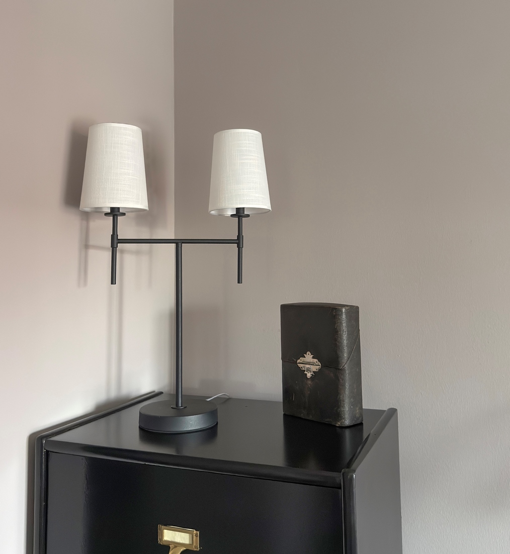 Bordslampa Verbier från Aneta Lighting har en tvåarmad, klassisk och tidlös design i svart metall med lätt ruggad finish och vita textilskärmar. Skapar ett mjukt, dämpat ljus och fungerar perfekt som dekorativ belysning på skänk eller sidobord i vardagsrum, hall eller sovrum. Bordslampan levereras med en vit sladd med strömbrytare. Rekommenderad ljuskälla: E14, max 20W. Ljuskälla ingår ej.