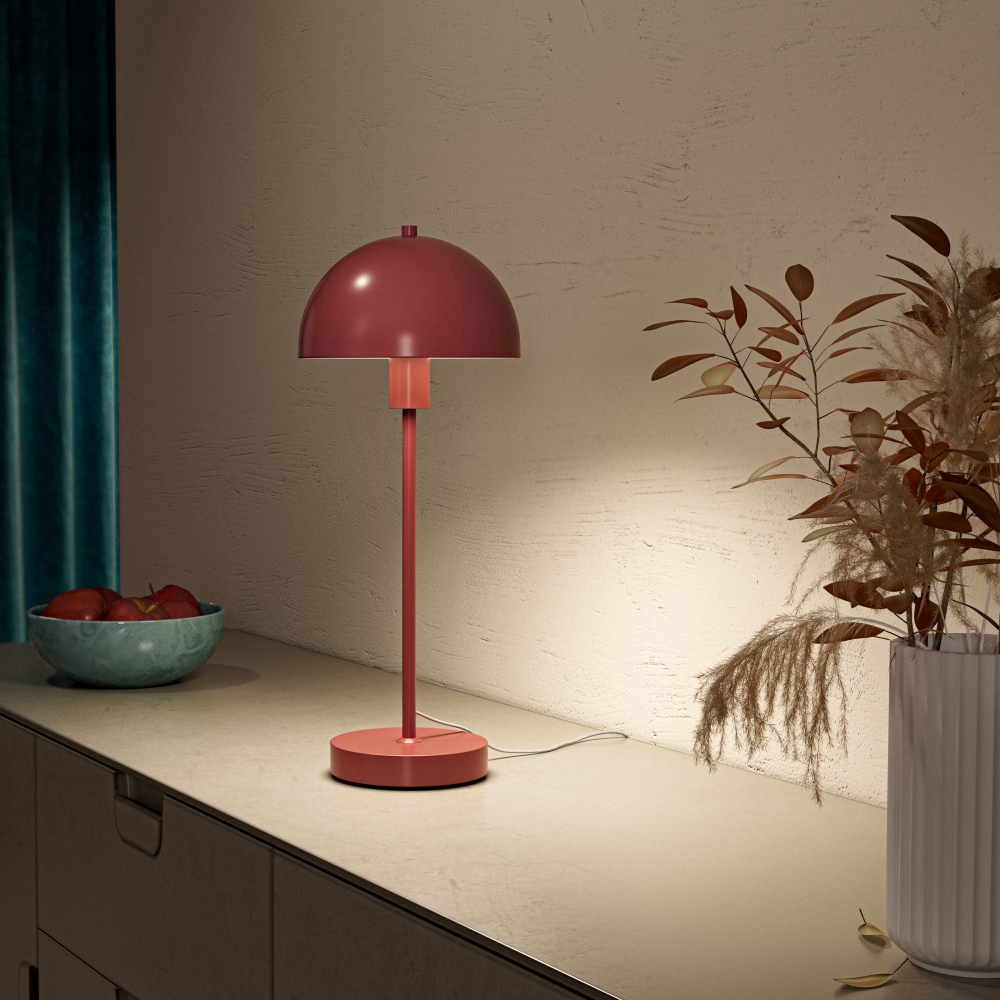 Bordslampa Vienda från Herstal i vinröd metall med elegant glaskupa. Lampan har en tidlös och stilren design med en mjukt kupolformad skärm som sprider ett behagligt ljus i rummet. Tack vare sin nätta form är den enkel att placera och är lika fin på ett sidobord i vardagsrummet som på nattduksbordet bredvid sängen.