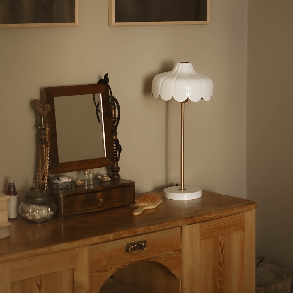 Bordslampa Wells från PR Home har en charmig design i vit metall med en varm, guldfärgad insida. Den blomformade designen ger en romantisk och inbjudande känsla, som är perfekt för fönstret eller sidobordet. Wells levereras med en 1,5 meter svart plastsladd med strömbrytare. Till Wells rekommendera en ljuskälla med E27 sockel, max 25W. Ljuskälla ingår ej.