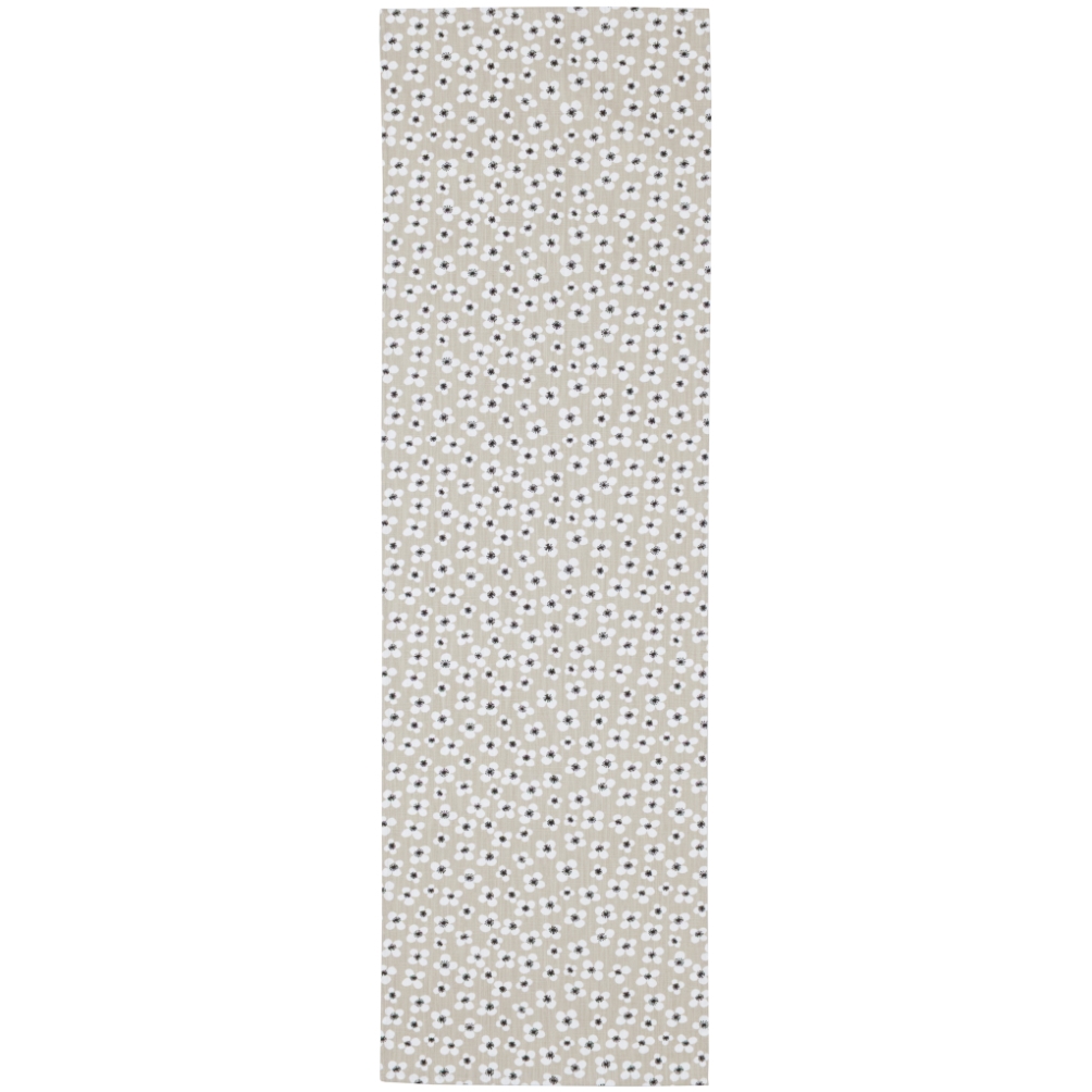 Bordslöpare Belle Amie, 45x150 cm, från Almedahls i beige med ett stiliserat blommönster ritat av Marianne Westman – en av Sveriges mest uppskattade formgivare från 1900-talets mitt.