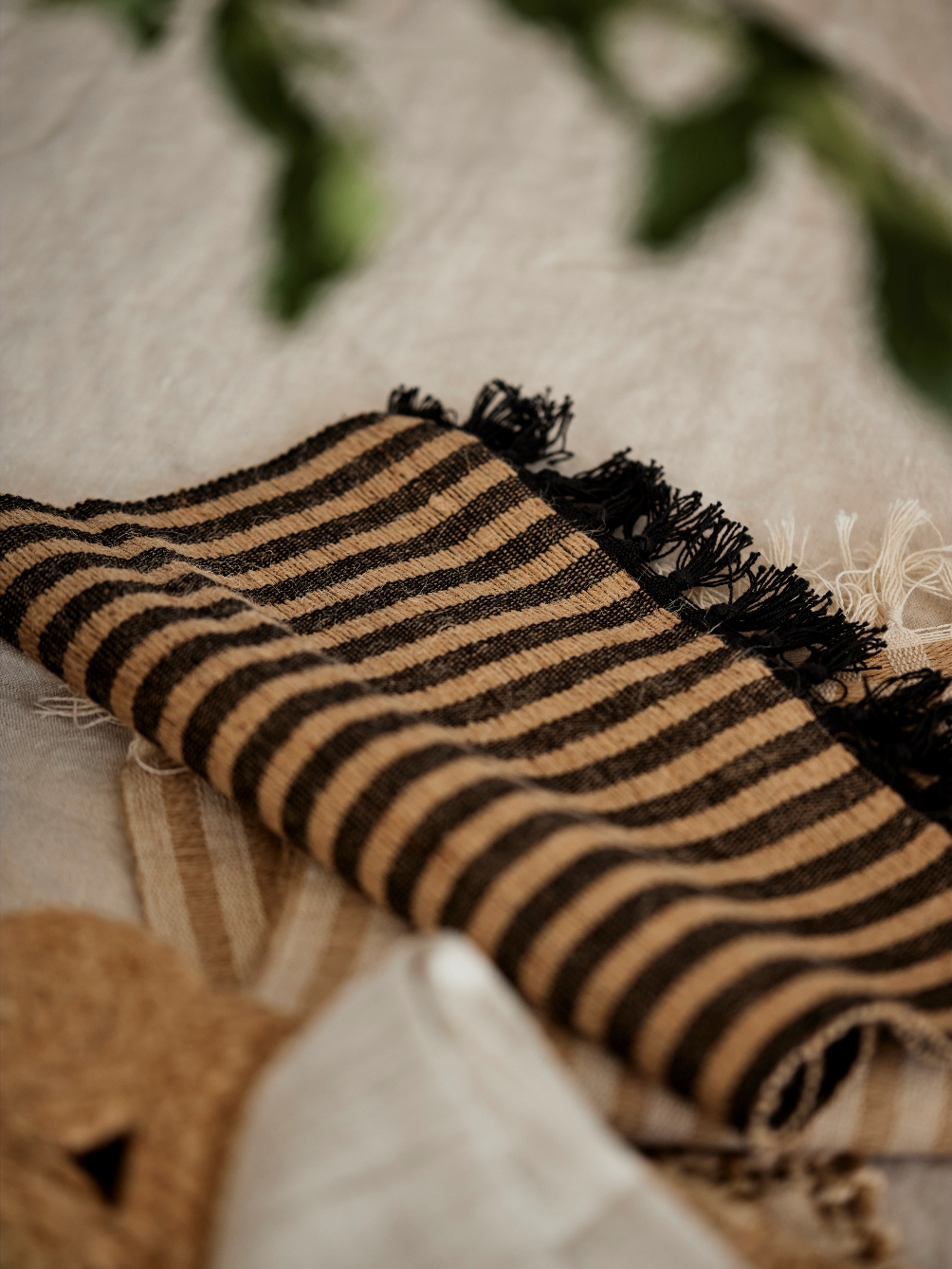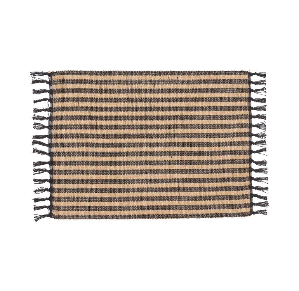 Bordstablett Adam svart från Svanefors i en randig mix av bomull och jute som ger en rustik och naturlig känsla. De dekorativa fransarna på kortsidorna förstärker den charmiga designen och skapar en jordnära och inbjudande dukning. Storlek 33x45 cm.