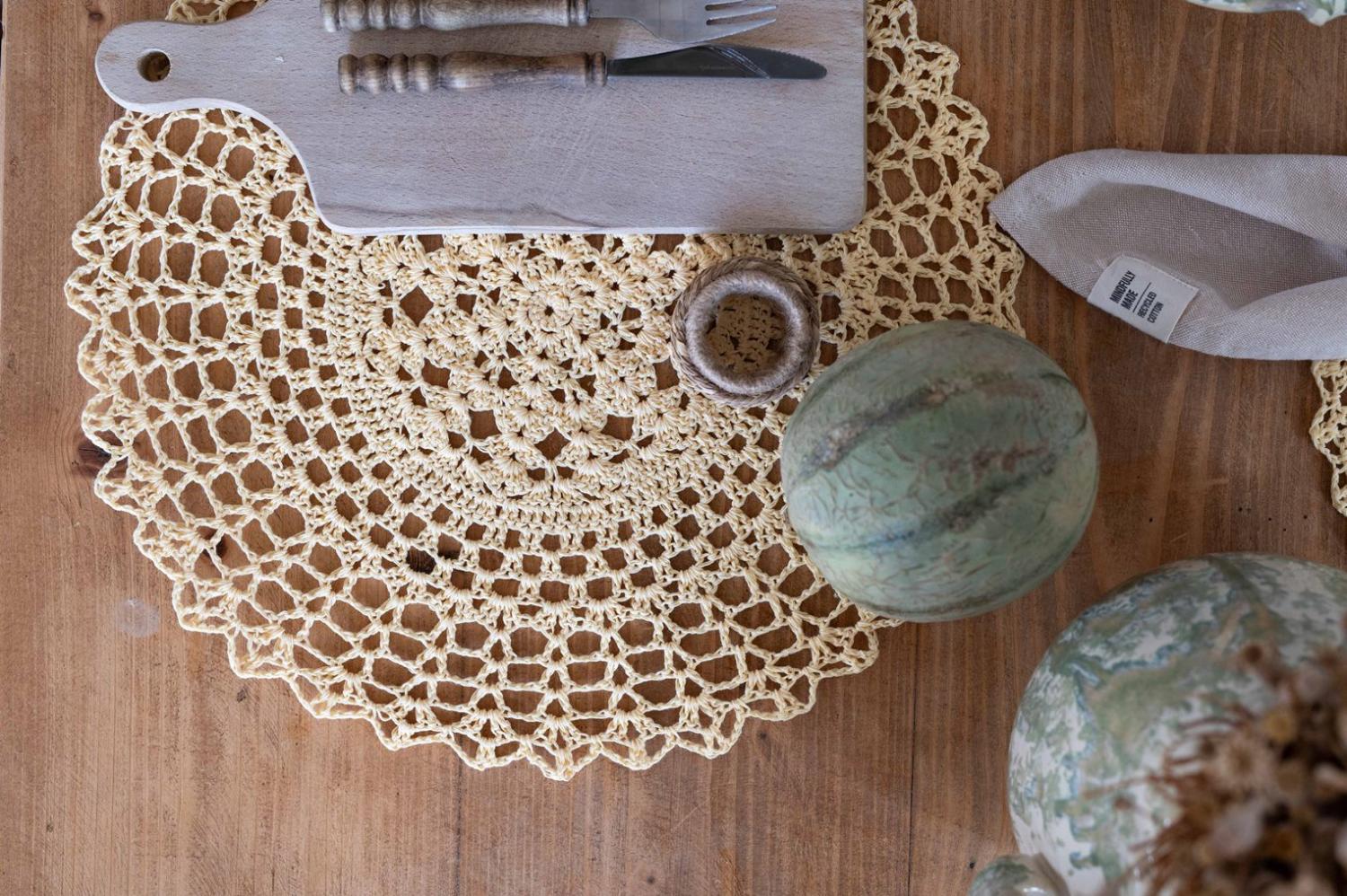 Bordstablett Britta från Fondaco i en vacker gul nyans är en rund, handvirkad bordstablett med ett vackert virkmönster och detaljerade maskor som skapar en känsla av hantverk, tradition och tidlös elegans. Diameter: 38 cm. Pris per styck: 64 kr/st. Säljes i 6-pack.
