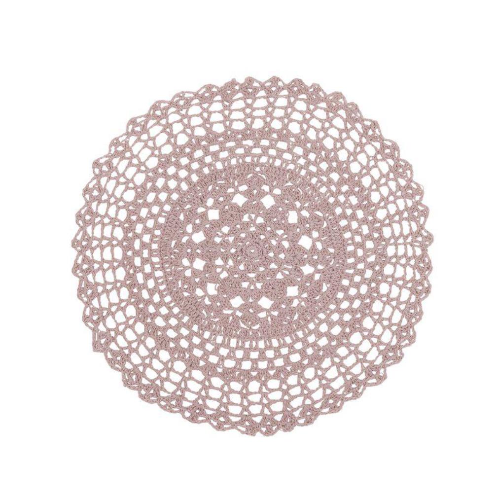 Bordstablett Britta från Fondaco i en vacker rosa nyans är en rund, handvirkad bordstablett med ett vackert virkmönster och detaljerade maskor som skapar en känsla av hantverk, tradition och tidlös elegans. Diameter: 38 cm. Pris per styck: 64 kr/st. Säljes i 6-pack.