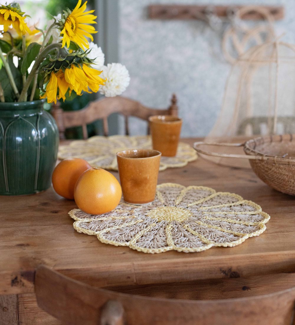 Bordstablett Fia från Fondaco är tillverkad av flätat papper och formad som en blomma i vacker gul färg, en perfekt detalj som för tankarna till vår och sommar. Den enkla men vackra designen passar lika bra till festliga dukningar som till vardagens måltider och ger bordet ett elegant och lekfullt inslag. Diametern är 38 cm. Pris per styck: 66 kr/st. Säljes i 6-pack.