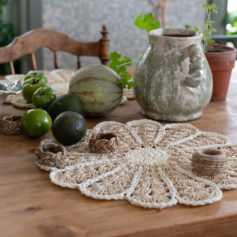 Bordstablett Fia från Fondaco är tillverkad av flätat papper och formad som en blomma i ljus offwhite, en perfekt detalj som för tankarna till vår och sommar. Den enkla men vackra designen passar lika bra till festliga dukningar som till vardagens måltider och ger bordet ett elegant och lekfullt inslag. Diametern är 38 cm. Pris per styck: 66 kr/st. Säljes i 6-pack.