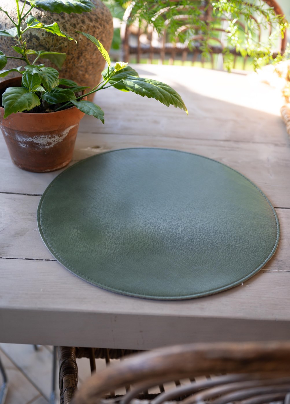 Bordstablett Moana från Fondaco har en modern, rund design i mörkgrönt. Ytan är utformad för att efterlikna äkta läder och ger ett lyxigt och elegant intryck. Bordstabletten är lätt att rengöra och passar utmärkt för både vardagliga måltider och festliga tillfällen.