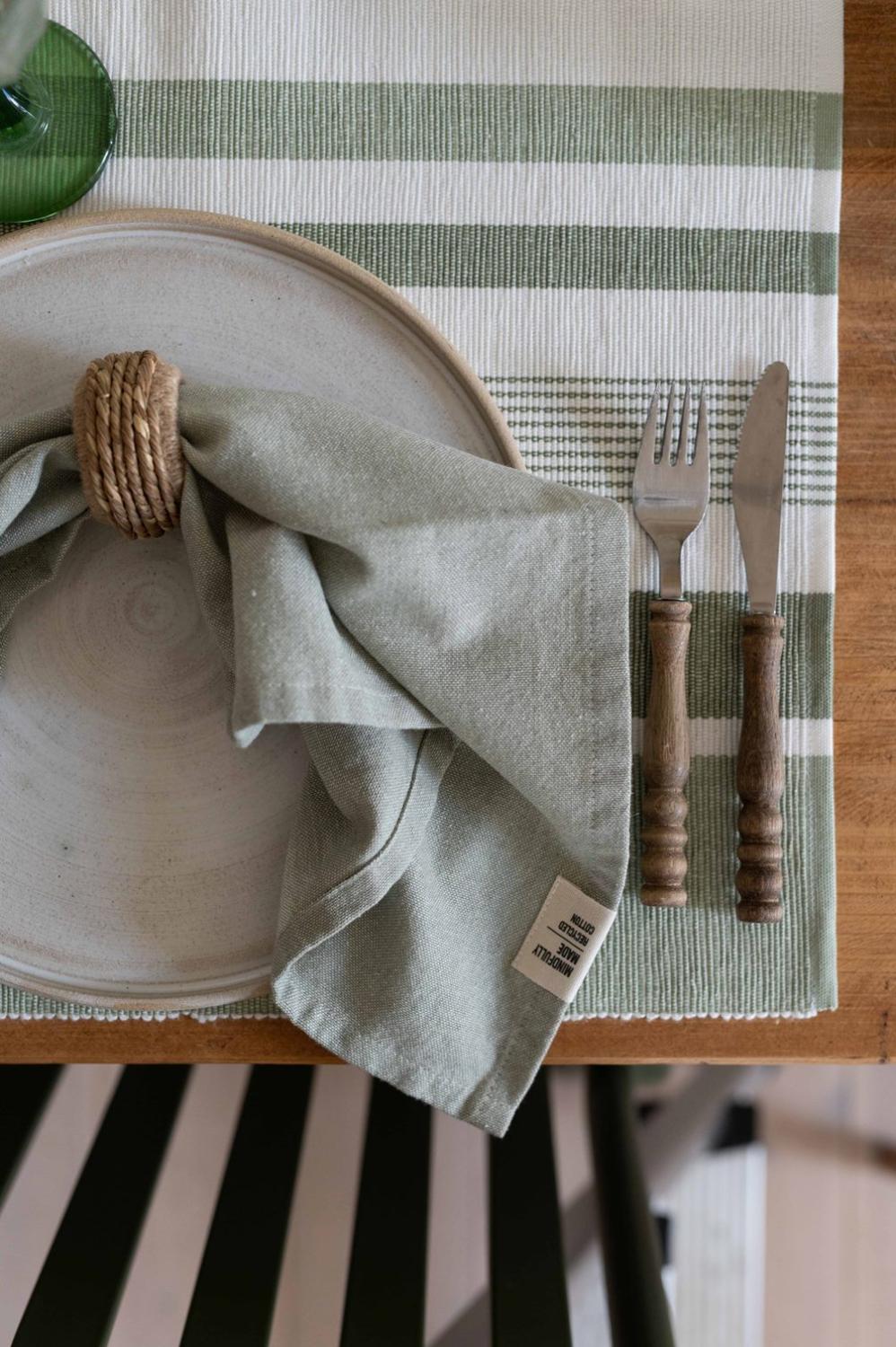 Bordstablett Petter från Fondaco i grön ripsvävd bomull med en tidlös design. De oregelbundna ränderna skapar ett klassiskt uttryck medan den karakteristiska ripstrukturen ger en vacker textur och tydlig vävkaraktär. Bordstabletten är perfekt för både vardagsdukningar och festliga tillfällen. Storlek: 35x45cm. Pris per styck: 40 kr/st. Säljes i 6-pack.