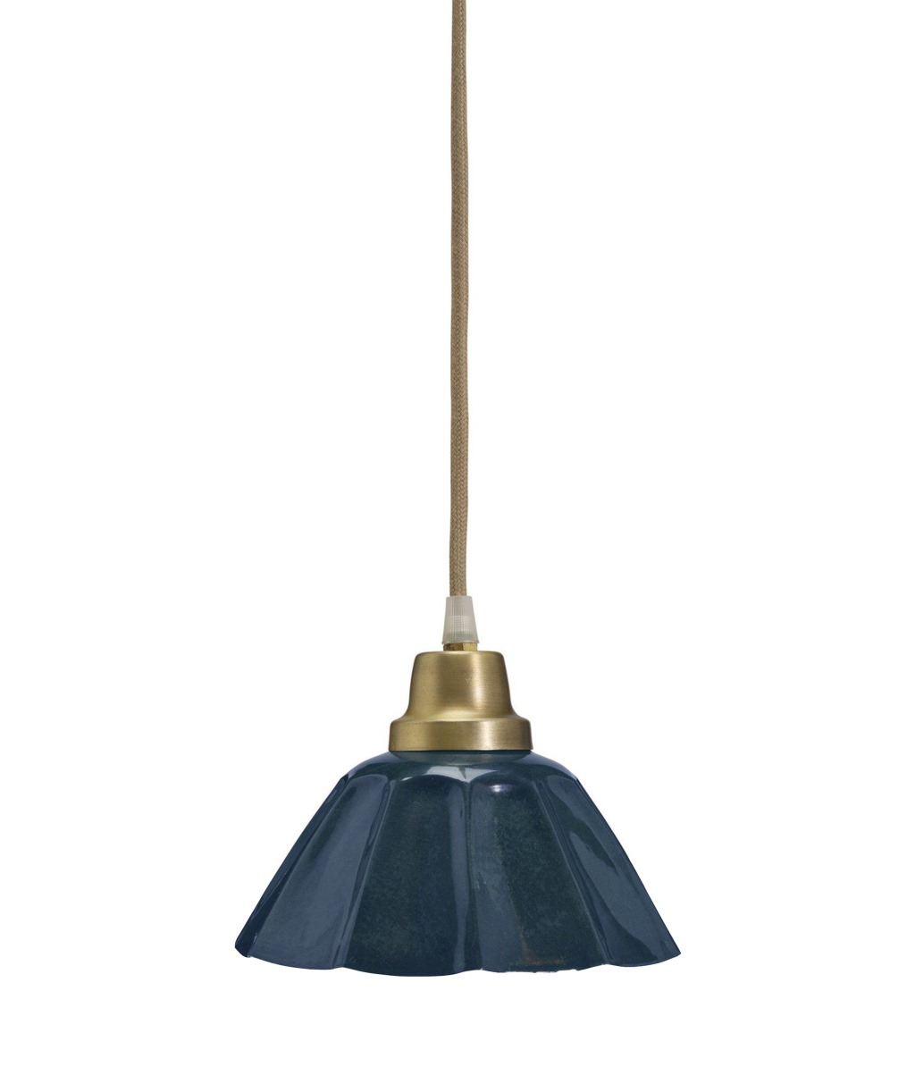 Fönsterlampa Ester från PR Home har en veckad metallskärm i blått med emaljfinish som efterliknar marmor, en skomakardesign i modern och rustik tappning. Den nätta storleken gör den perfekt i fönstret, ovanför köksbänken eller i grupp. Den linnefärgade textilsladden och topp i antikmässing förstärker den vintageinspirerade känslan.