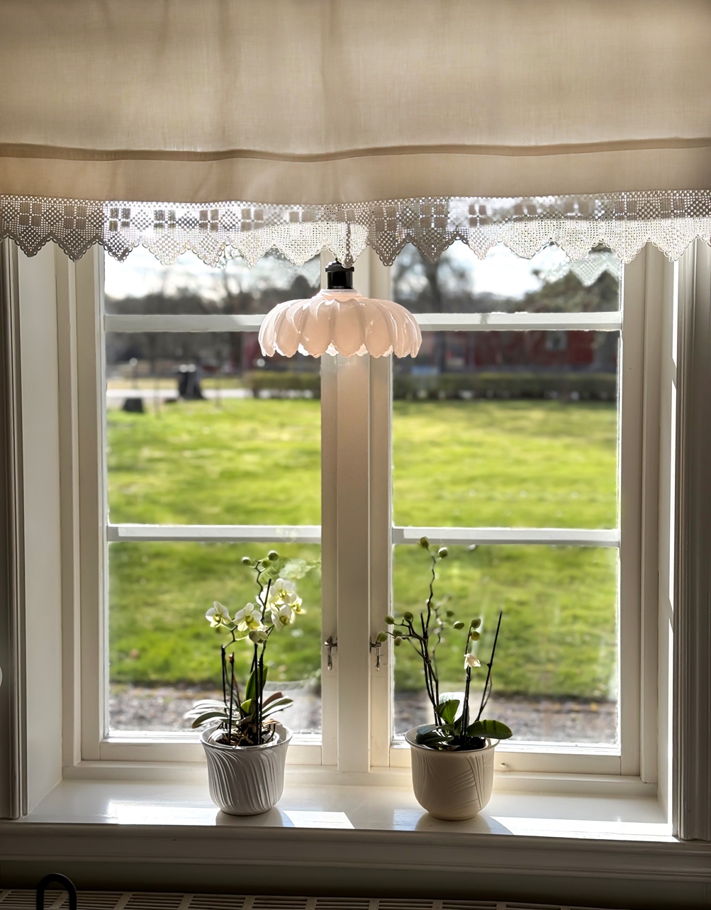 Fönsterlampa Sofia från Aneta Lighting har en vacker, blomsterinspirerad glasskärm i vitt och en lamphållare i svart metall. Den romantiska vintagestilen gör fönsterlampan till en charmig inredningsdetalj som passar i både klassiska, lantliga och moderna hem.