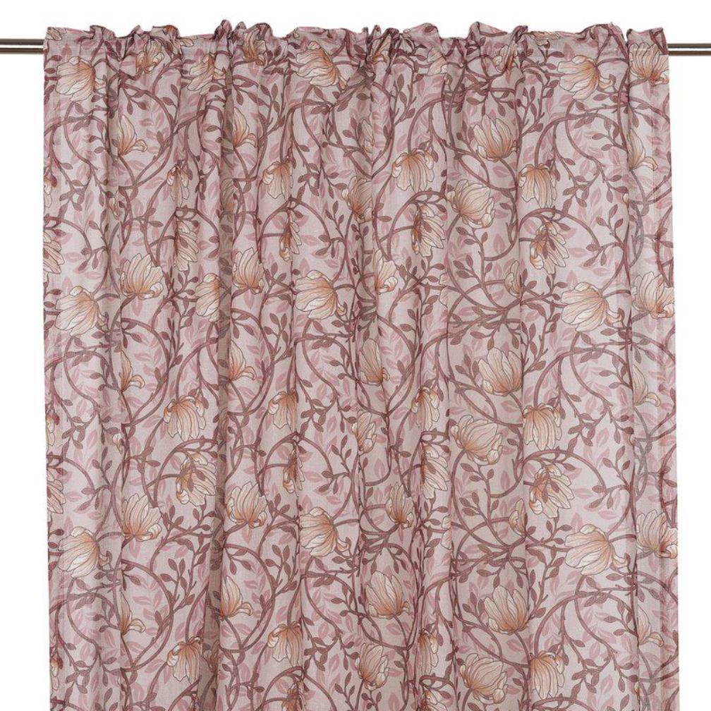 Gardin Emma från Fondaco är tillverkad i ett skirt tyg med ett vackert blommönster och slingrande bladverk på rosa botten. Tyget släpper in ljuset på ett mjukt och behagligt sätt och skapar en lätt och luftig känsla i rummet. Gardinen ger inredningen en romantisk och somrig touch och passar perfekt i både sovrum och vardagsrum. Storlek: 135x250 cm. Säljes i 2-pack.