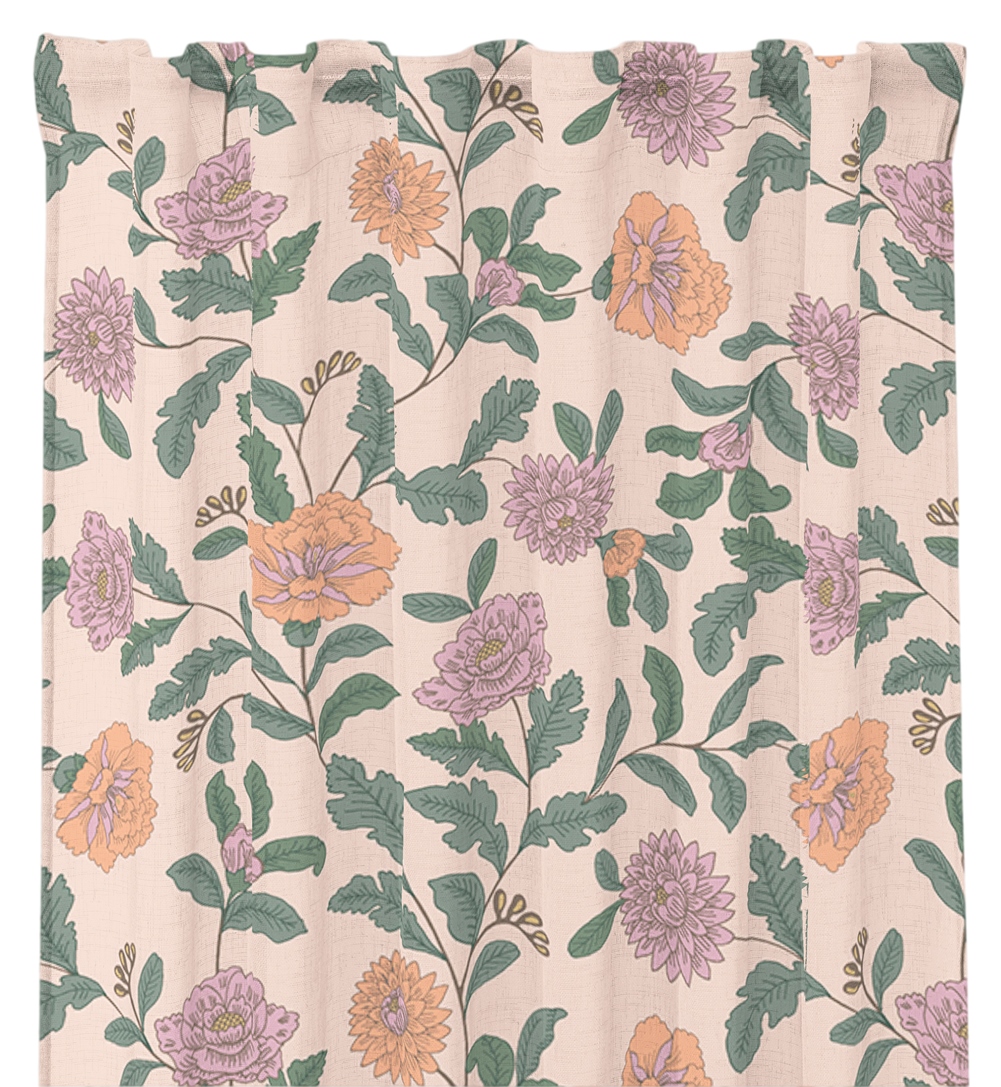 Multibandslängder Faye från Redlunds har ett vackert mönster med blommor och löv på en persikofärgad botten som ger rummet en mjuk och harmonisk känsla. Gardinerna är tillverkade i 100% polyester och tryckta på tvåvägsslubb, en slubvävd kvalitet där trådar i varierande tjocklek skapar en unik struktur och en fin, levande slubeffekt.